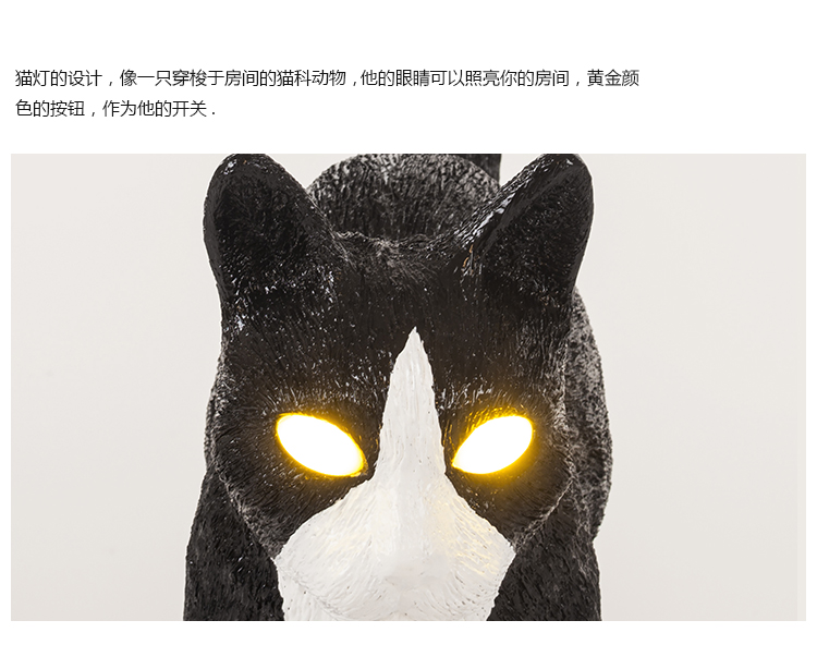 猫灯的设计,像一只穿梭于房间的猫科动物, 他的眼睛可以照亮你的房间,黄金颜色的按钮,作为他的开关.