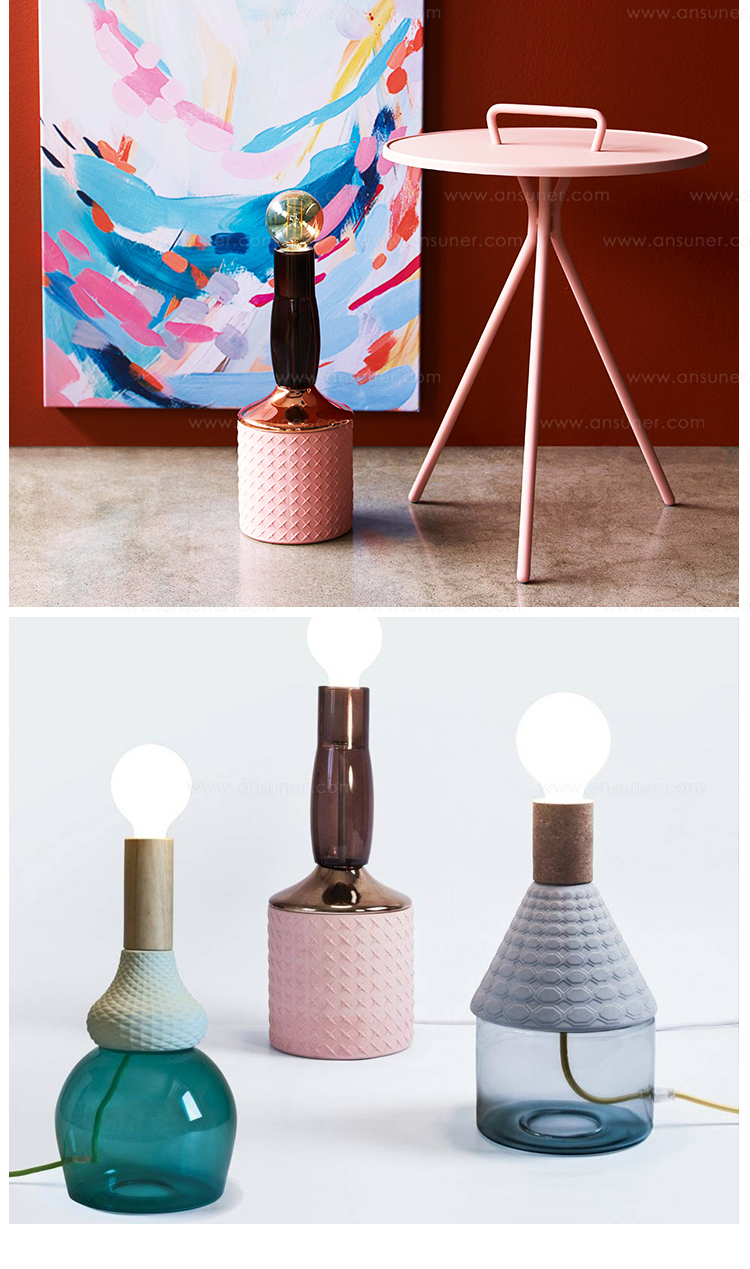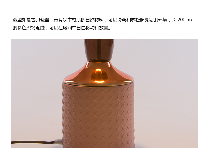 造型如复古的瓷器,带有软木材质的自然材料,可以协调和放松照亮您的环境,长200cm的彩色织物电线,可以在房间中自由移动和放置。