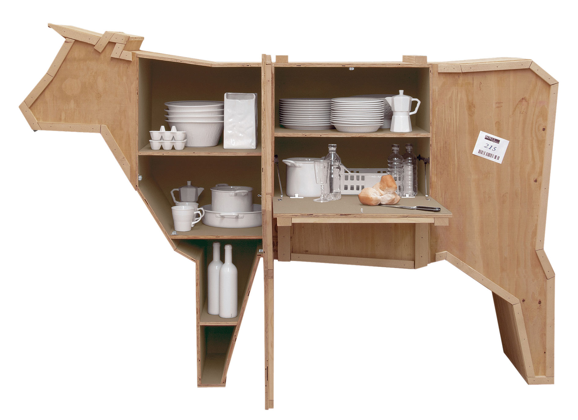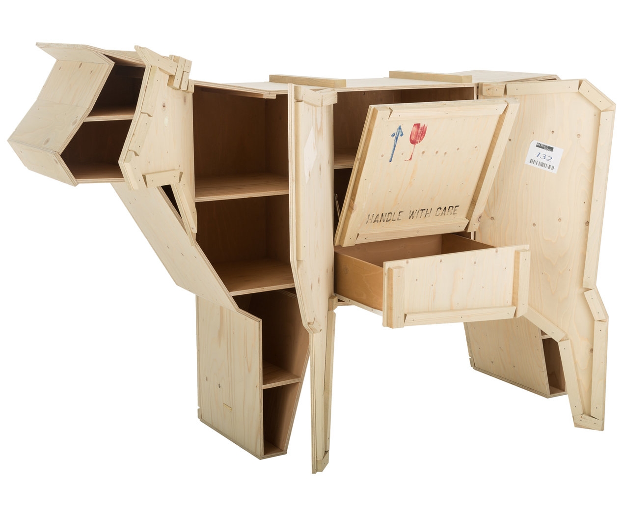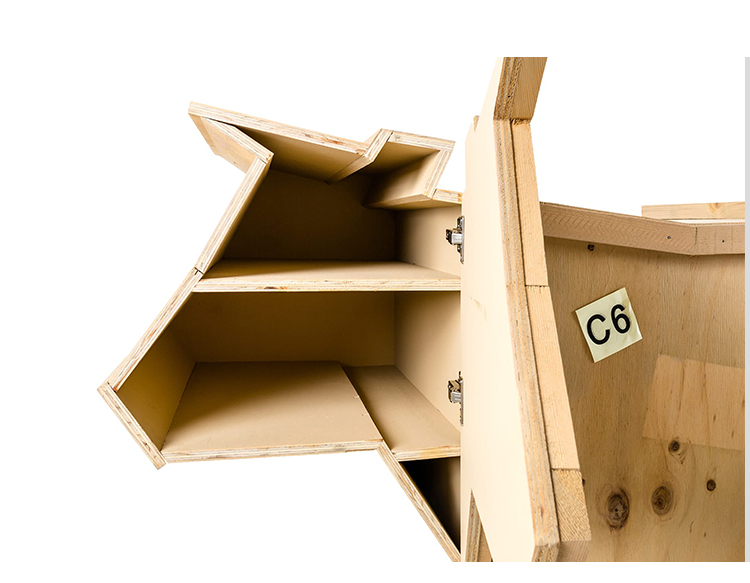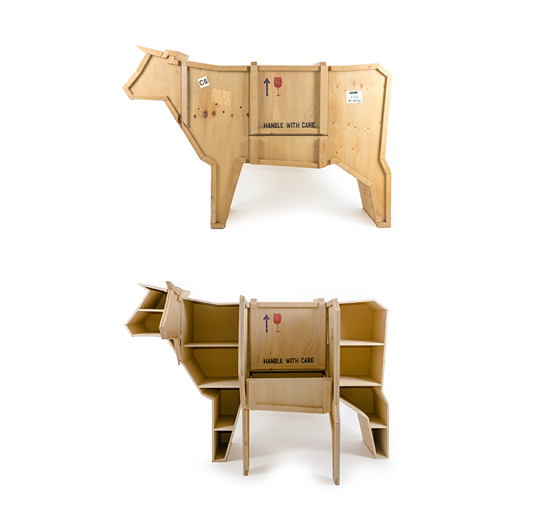 讽刺是一件严肃的事情,如果在微笑的同时让我们思考。动物板条箱协会很有趣,但同时也让我们对人类与自然的关系感到敏感。这件家具作品代表了一种荒谬的形象,动物们被运来运去。可能吗?为了更好地表达这个概念,我们选择了三种典型的农场动物,一头牛,一头猪和一只鸭子。每一个可见的瑕疵都是这件作品的特色,为了尊重原作的诗意,这些作品都是用同样的工艺制作而成,用于真正的运输板条箱。