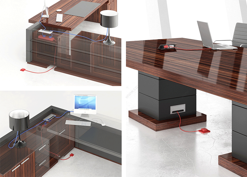 | · 班台分内外侧隐蔽式走线通过副台底板和侧板进线口连接地插,实现进线完全隐藏,台面电器可直接打开台面走线盖连接电源,实用方便、灵活, 电源连接配件可根据个人爱好任意选择 |