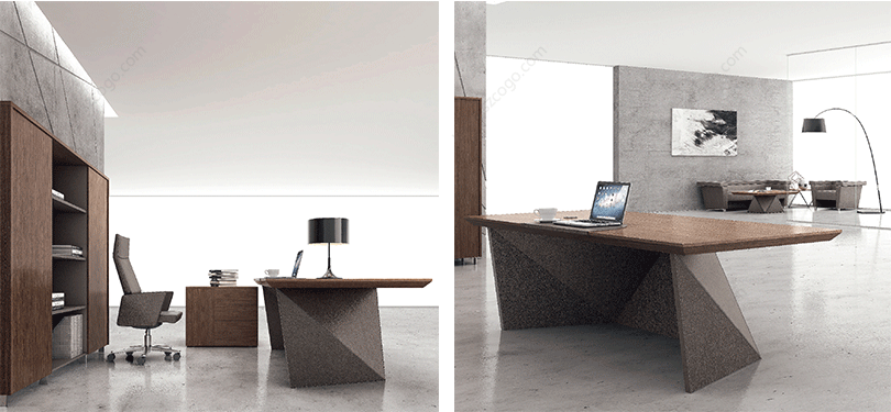 威睿系列,最大的亮点是独特的切割面。打破整体划一的家具造型模式,采用几何体构造设计手法,大尺度楔形宽体切面造型,如钻石的刻面与腰面错落有致,造出流畅的线条感。将现代建筑设计元素融入现代办公空间,结合整体布局配套延展,打造办公家具时尚前沿。主桌采用皮木覆膜工艺,机车缝合明线效果处理,浅胡桃皮木与皮椅搭配,整个空间充斥着个性化对比,金属材质简洁明快,流露出一种低调的奢华与睿智,配合银灰色的空间墙面,使得办公家具与整体的风格一脉相承。"