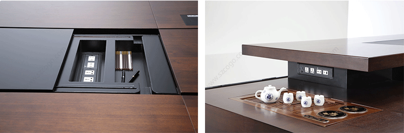 隐藏式插座和放置小物品小槽,使桌面更整洁 |