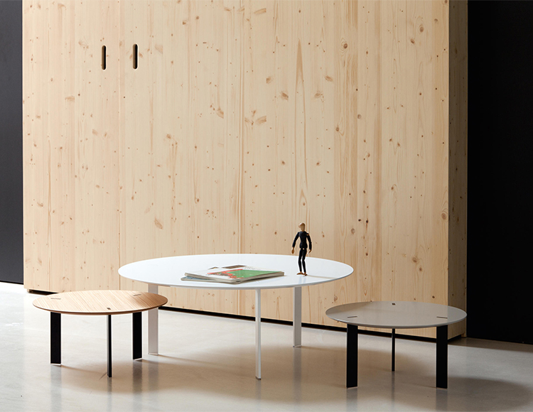 桌面采用漆面MDF或橡木贴面,由Viccarbe提供的饰面和带透明尖端的漆钢腿。