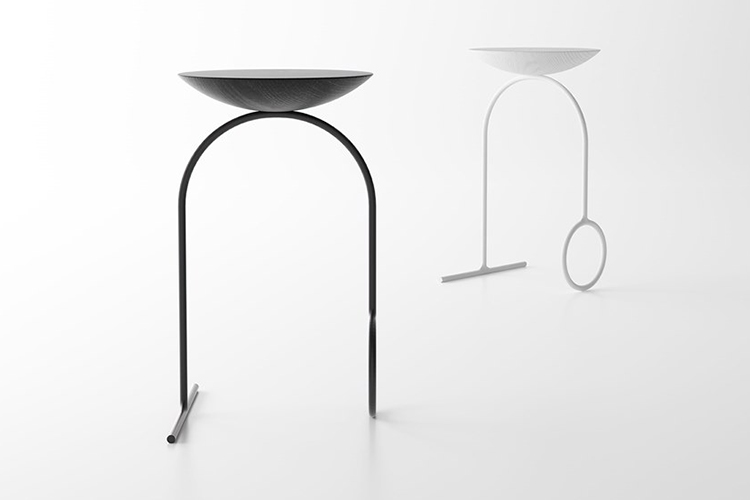橡木碗放在弯曲的金属框架上,该框架由形成腿部的圆和直线组成。