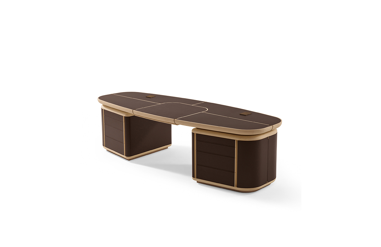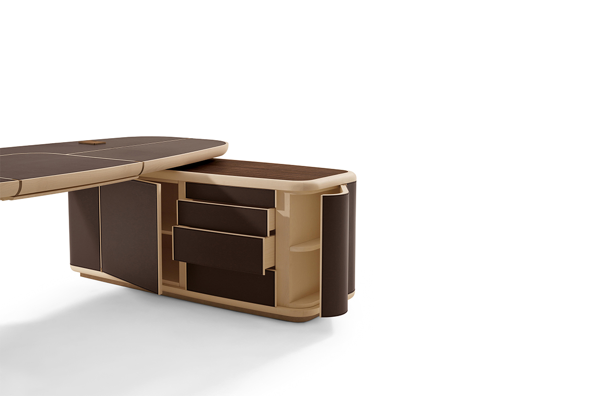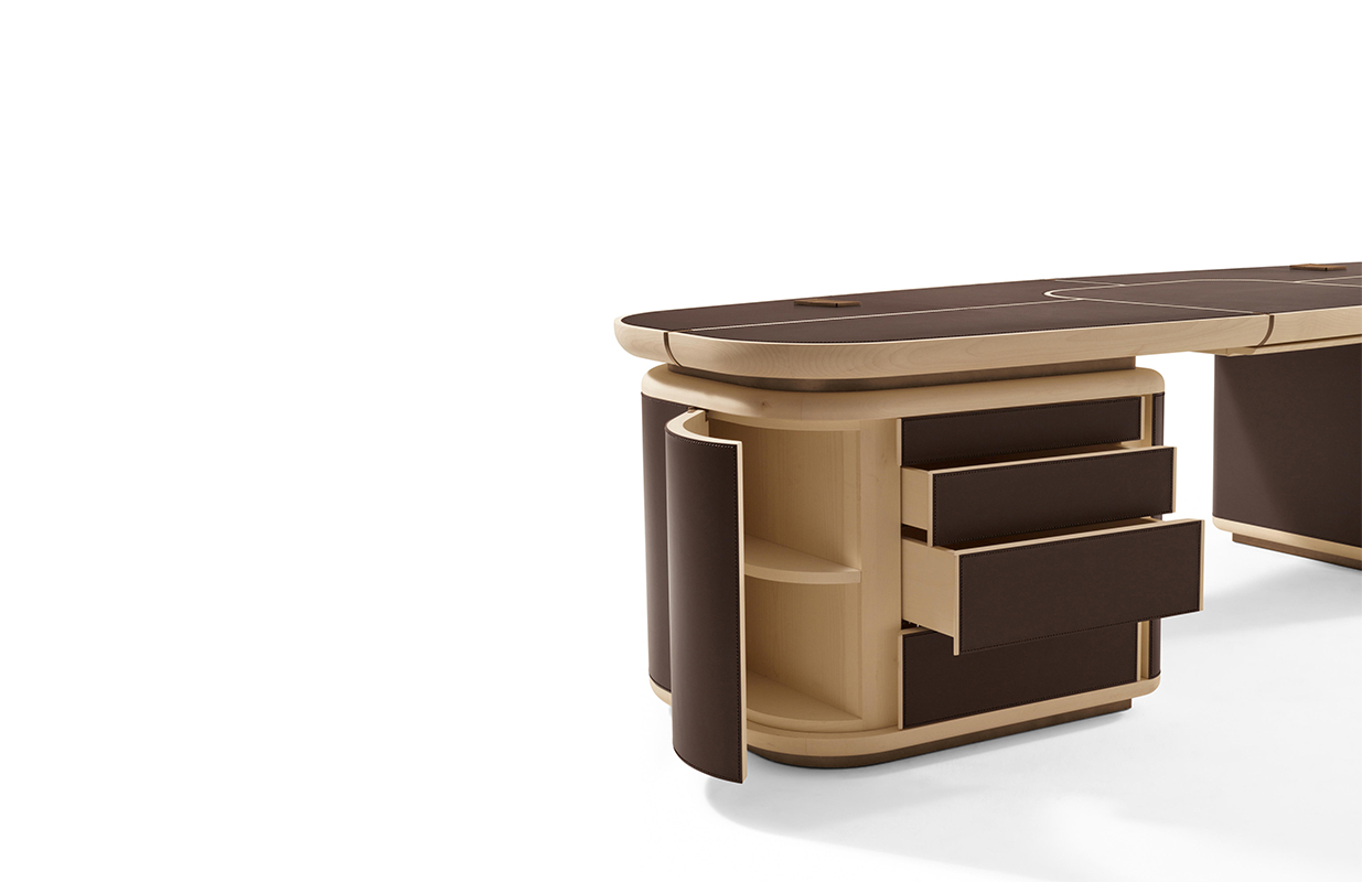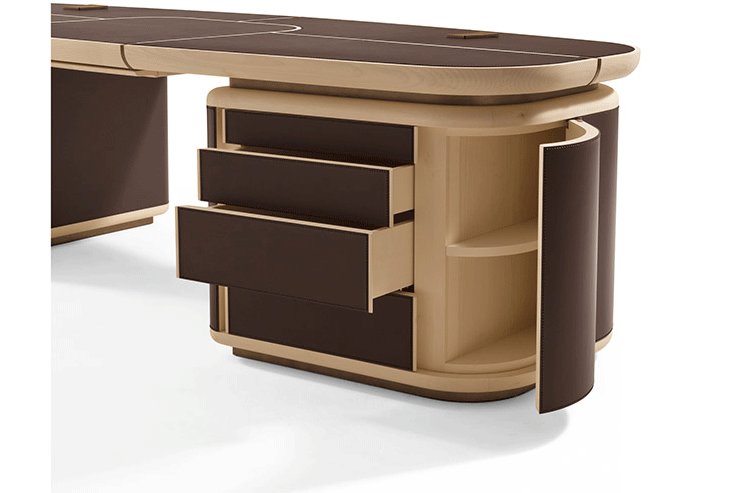抽屉的柜子是在弯曲胶合板覆盖着马鞍 皮革,完全可移动的抽屉休会 系统关闭滑动跑步者和沉默。 一个中央滑 抽屉里放置两个柜子的抽屉和之间 特点是车厢内的存在,覆盖 与马鞍皮革,笔和纸。 这个概要文件的基础, 顶部插入和抽屉的柜子之间的间隔 和顶部画在青铜色自然效果。