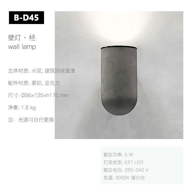 “柸”曾获2014年度中国制造之美大奖,从理念到材料,从配件到功耗,我们尽可能极致。 扯一团光,塞进杯里,安在墙上。 杯间溢彩,杯底流光,用柸中一团光,点亮一扇墙的沉闷。 日常在细微处美着,华体会体育官方在线官网用敏锐的洞察力,赋予它混凝土的工业气息。 一体出模造就了柸的细腻肌理,水泥特有的孔洞质感使它平添一股自然美感。金属色块稳稳地衔接着杯状水泥灯身与墙面。