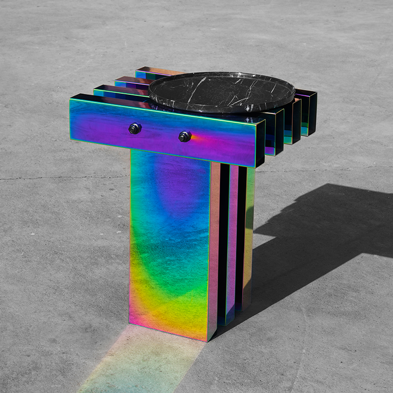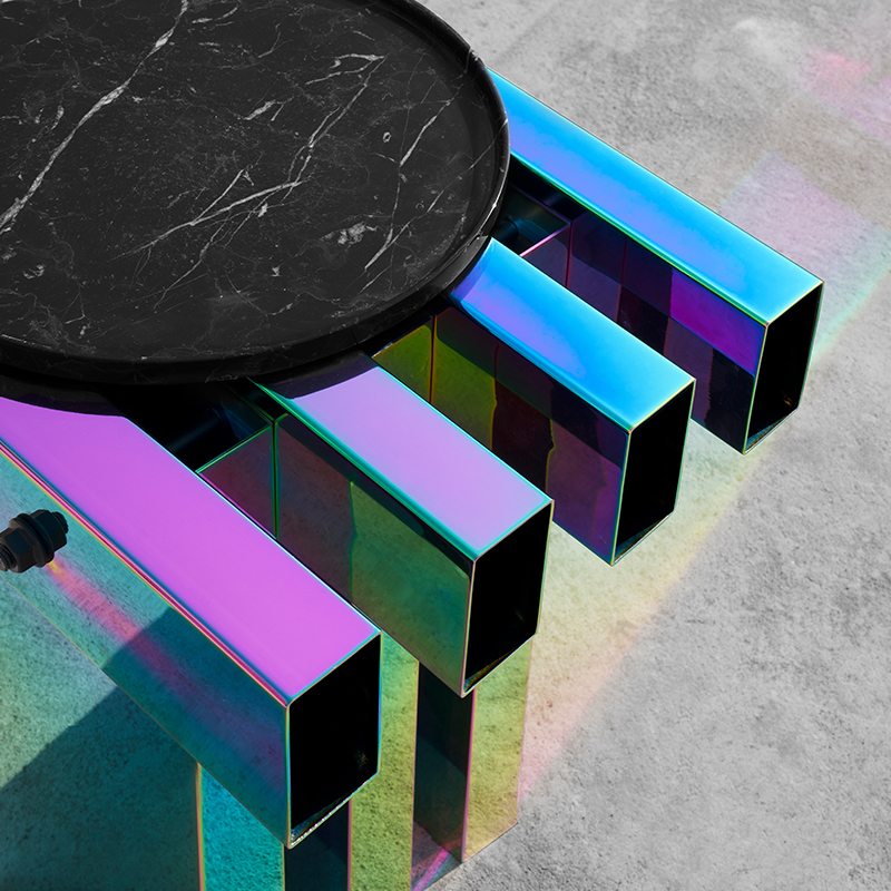 横竖横竖重复的组合方式,是来自草根的语言。常见工地搭台、围板,木方条拼组的,只需一次性的耐用而形成粗暴又稳固的结构方式。 极其炫丽浮夸的幻彩与粗鲁蛮横的草根形式形成反差,产生迷幻、跳脱、超现实的戏剧感受,似乎欲望的幻相,真实得不切实际。