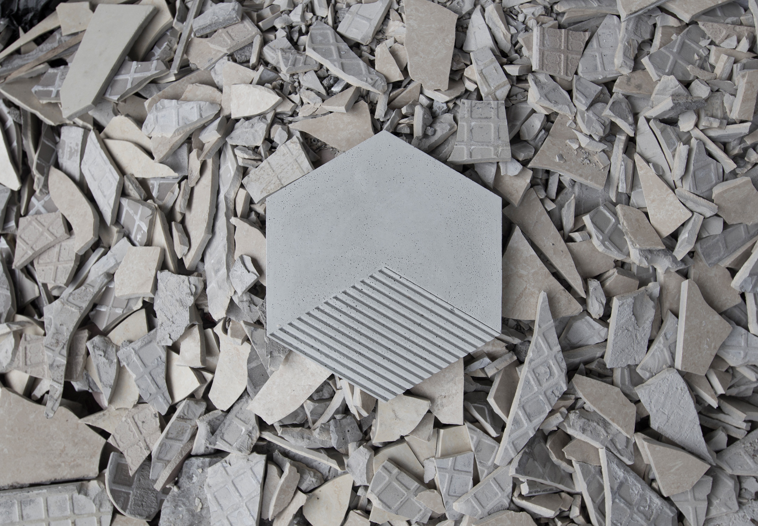 消费时代的春雨催生出一茬茬 新需求,也催生了人类欲望的疯长。 生产不再只是满足生存的基本幸福,人类垄断、自然破产、大地亏空,欲望的掺杂让生产虚假地膨胀, 大量陶瓷边角料的堆弃成为最佳注脚。将陶瓷的沉痛哀鸣一并搅碎倒进混凝土骨料,在流水线的模子里灌造极致。 一方方,灰白,坚韧,平滑,庄重,是生命死来复生的肃穆,是欲望燃尽的苍白沉默。