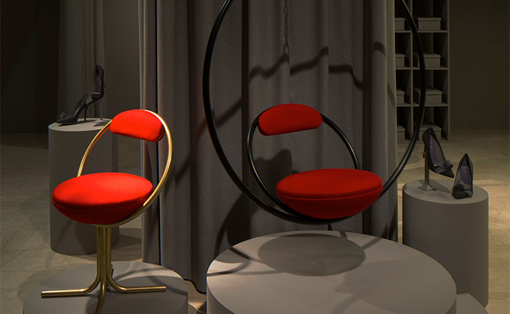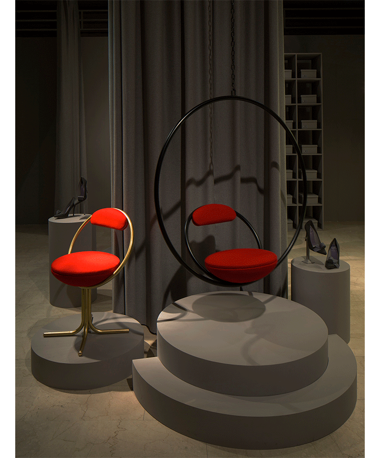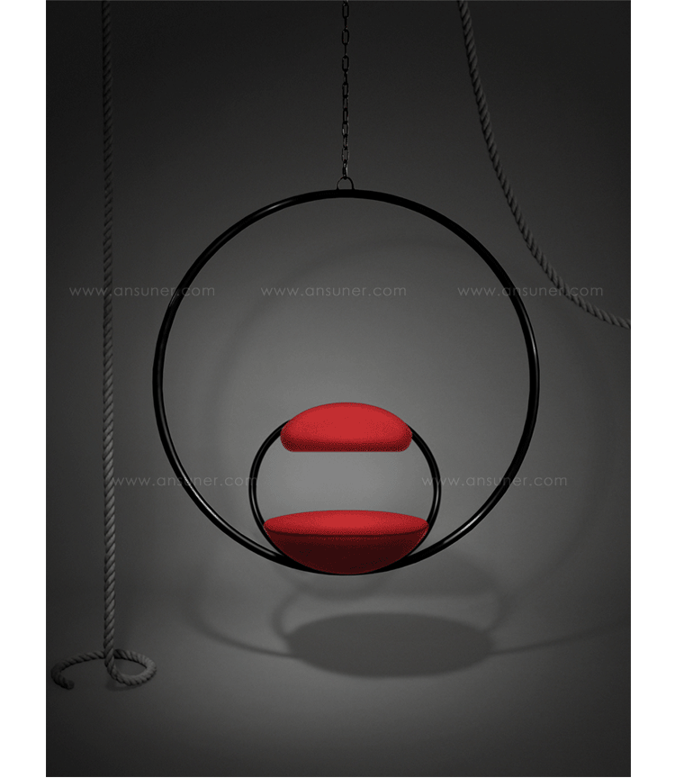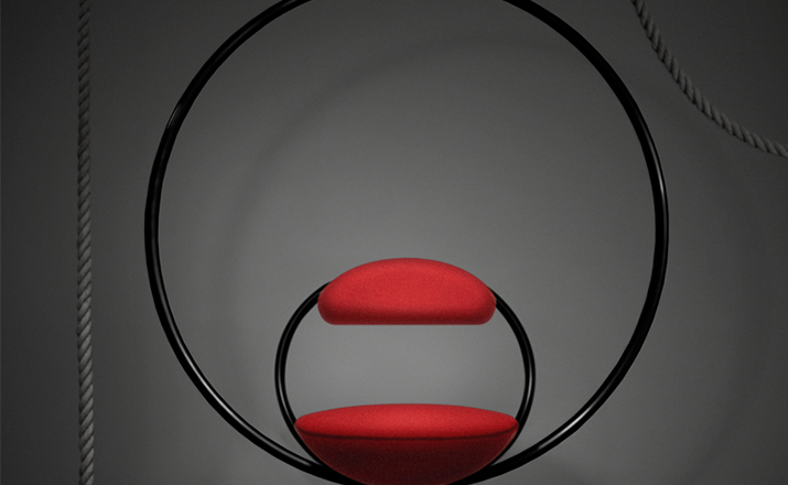 "Suspended from above,two brass plated steel circular hoops join to create the Hanging Hoop Chair,with a seat and backrest upholstered in Kvadrat wool.Also available in a satin black finish."