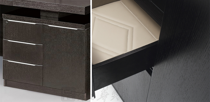 ※ 上图为大班台抽屉,优质铝合金拉手,抽屉内部真皮装饰。