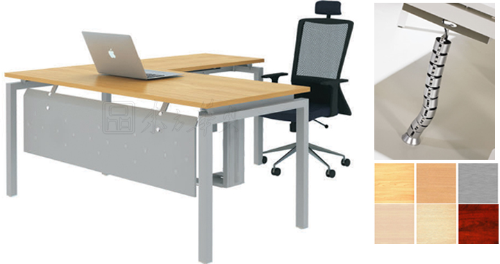 ※ 上图为职员桌正面图,采用现代简约的风格,以斑马木和喷塑不锈钢结合,丰富走线完美结合的集成功能设计展现,给人一种不受约束的感觉,丰富的多颜色选择,也是此款桌子的优质特色。