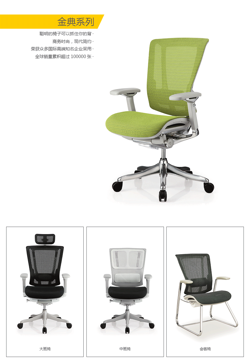 金典系列产品灵活度高,外观设计时尚,通过单杆操控多功能调整系统,使操控简便更人性化。优良的设计及精湛的力学与工学设计概念与一身,金典系列产品设计居于办公座椅行业前列,智慧移动腰背支撑系统,你怎么动他就怎么动。