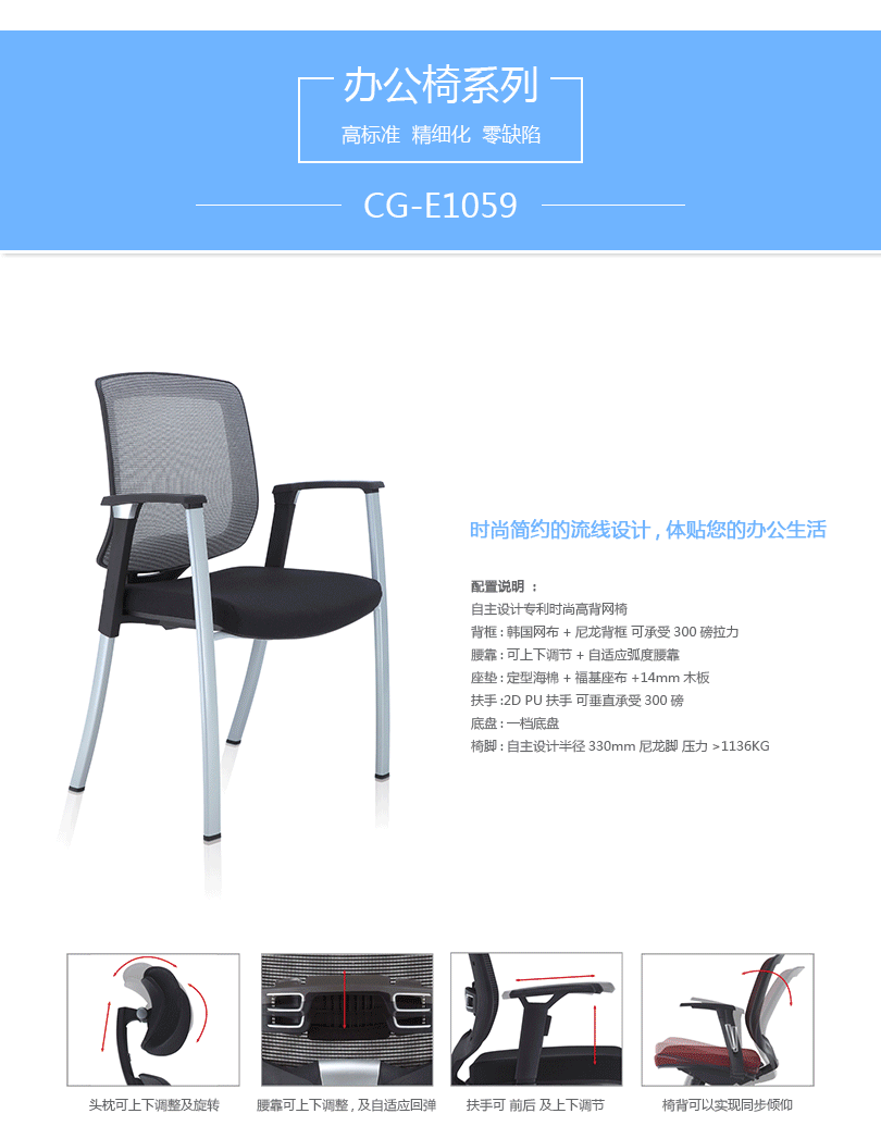 CG-E1057办公椅是一款符合人体工学的全功能性办公椅,力求使用者能充分理解其人性化的设计及达到最舒适的调节。