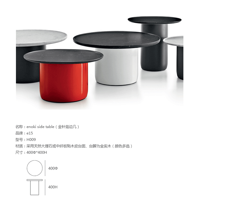 金针菇边几是2011年由 Philipp Mainzer 设计的。金针菇是一个通用的边几,由大理石、 实木组合和可用彩色钢。金针菇是有两种不同的直径和高度,边几面板厚30毫米。大理石亚光油着色,环保自然。为了避免刮伤的地板,边桌配备毡圈两件。