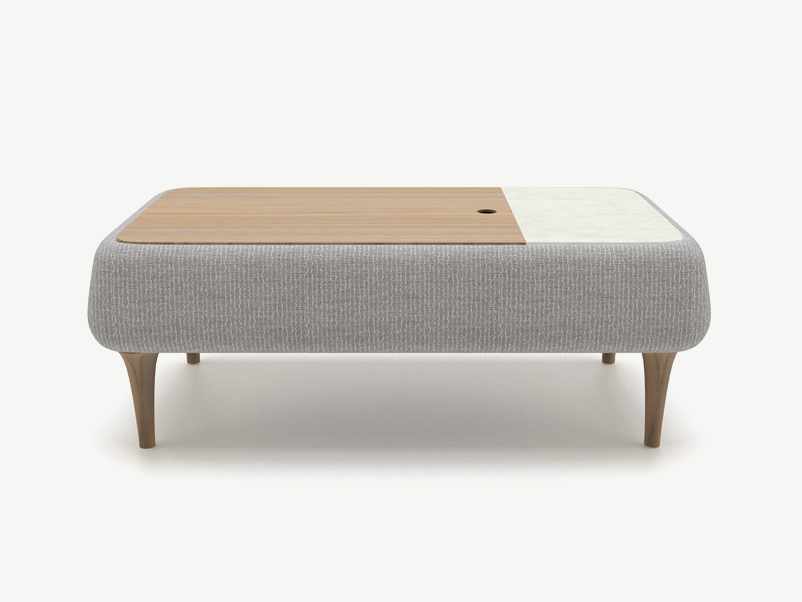 Etna coffee table carry on the spirit of the sofas completing the composition with an elegant piece that display armonius proportions and material balance with the use of solid wood feet, so upholstery, marble fix top and plywood lid on top of a storage for daily use.