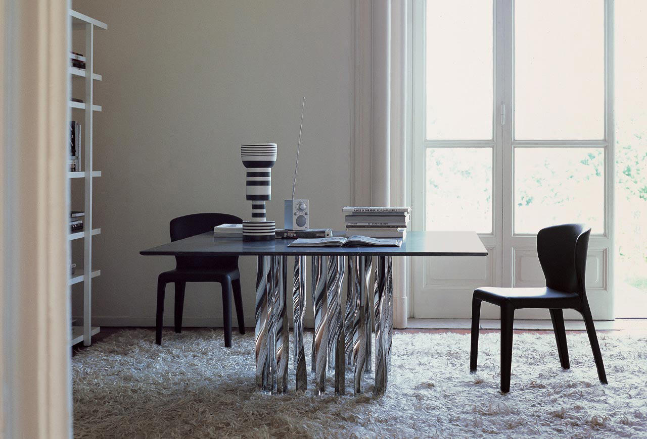 不锈钢电镀折叠而成独特脚架——大胆挑战由薄金属垂直条、微扭纵轴形成的桌几支撑,为家庭创造一个独特的景观