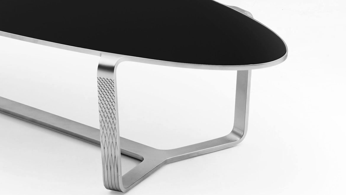 从一个极轻的铝制框架设计,椭圆形的椭圆形桌子被雕刻成几何图案,灵感来自于布加迪内部。这是一款高档的高档住宅,桌子上有一个烟熏的钢化玻璃,后面是传说中的布加迪蓝色。