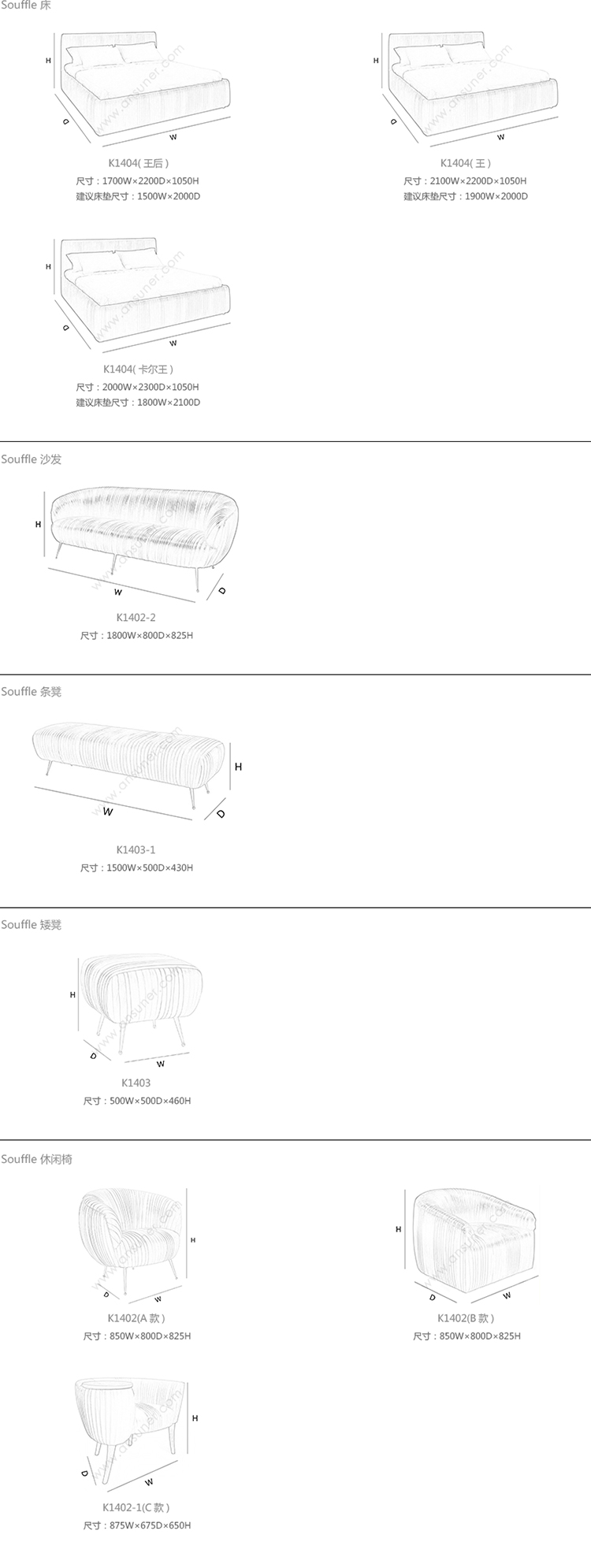 Souffle 床 系列尺寸/示意图