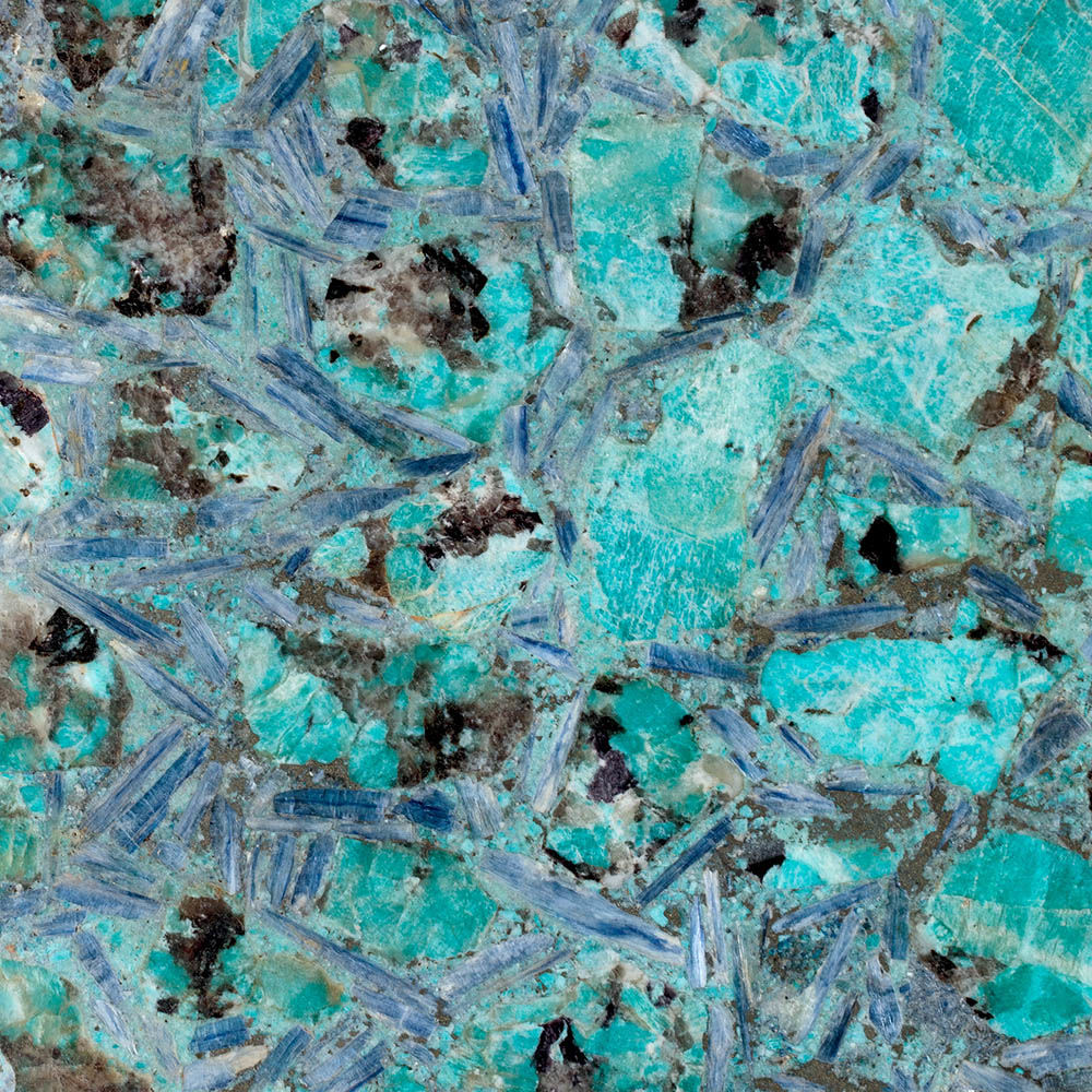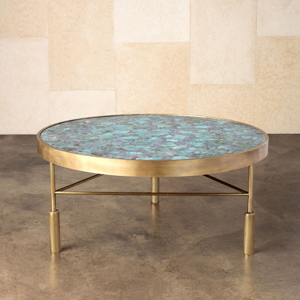 Sedona咖啡桌采用抛光和抛光的半宝石亚马逊石制成,采用抛光黄铜框架。每件作品都是独一无二。