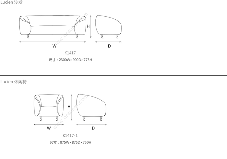 Lucien 沙发 系列尺寸/示意图