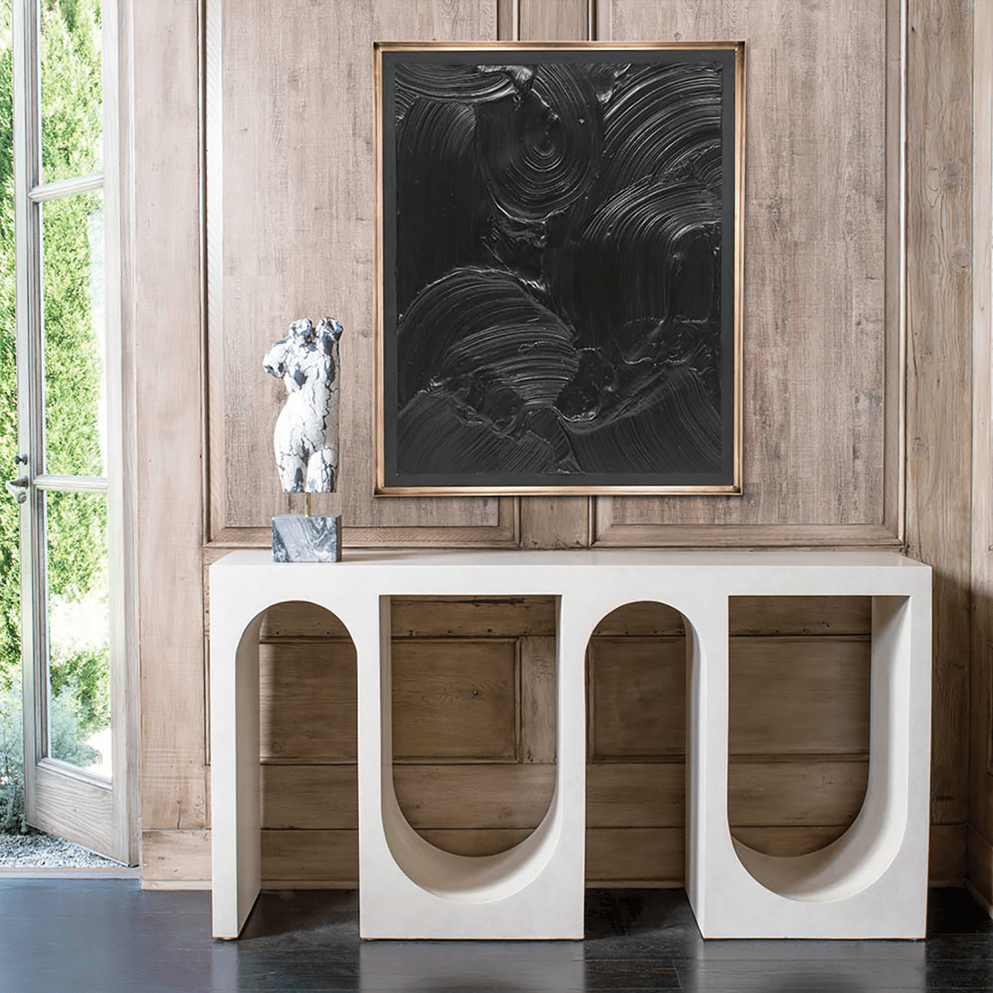 Roxbury玄关台采用实心树脂铸造,手工抹平石膏饰面,具有图形轮廓。 交替的拱形形成了这个独特的玄关台的形状,创造了空间几何和颜色的美丽调制。