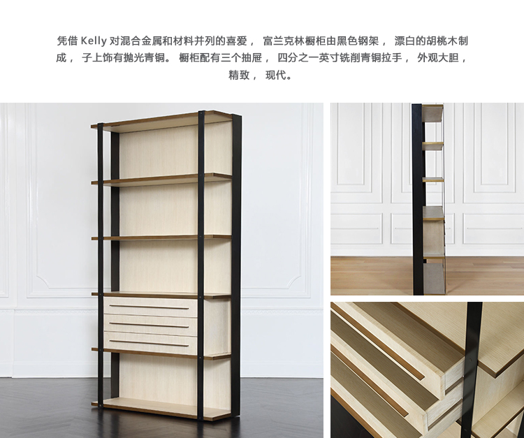 凭借Kelly对混合金属和材料并列的喜爱,富兰克林橱柜由黑色钢架,漂白的胡桃木制成,架子上饰有抛光青铜。 橱柜配有三个抽屉,四分之一英寸铣削青铜拉手,外观大胆,精致,现代。