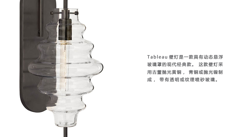 Tableau Large Sconce(Tableau大壁灯)是一款具有动态悬浮玻璃罩的现代经典款。 这款壁灯采用古董抛光黄铜,青铜或抛光镍制成,带有透明或纹理喷砂玻璃,适用于潮湿环境。