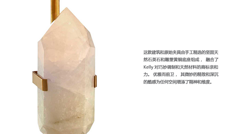 这款台灯由手工精选的坚固天然石英石和雕塑黄铜底座组成,融合了Kelly对巧妙调制和天然材料的商标亲和力。 优雅而前卫,其微妙的精致和深沉的酷感为任何空间增添了精神和维度。