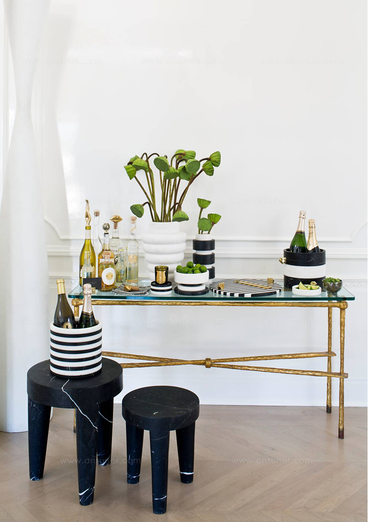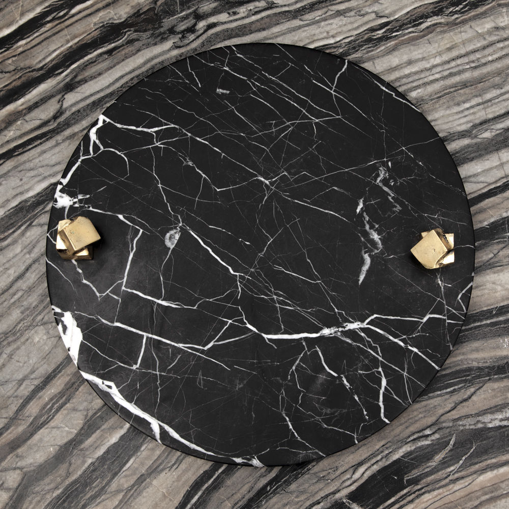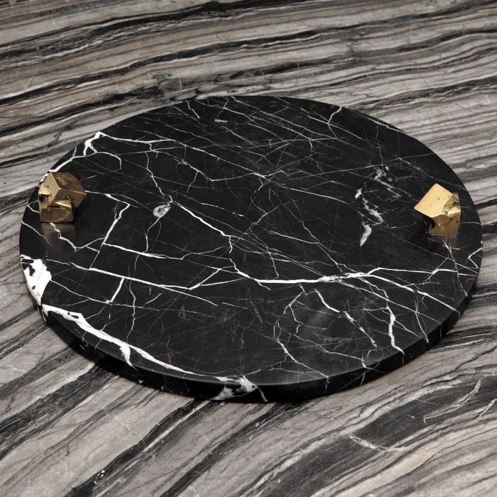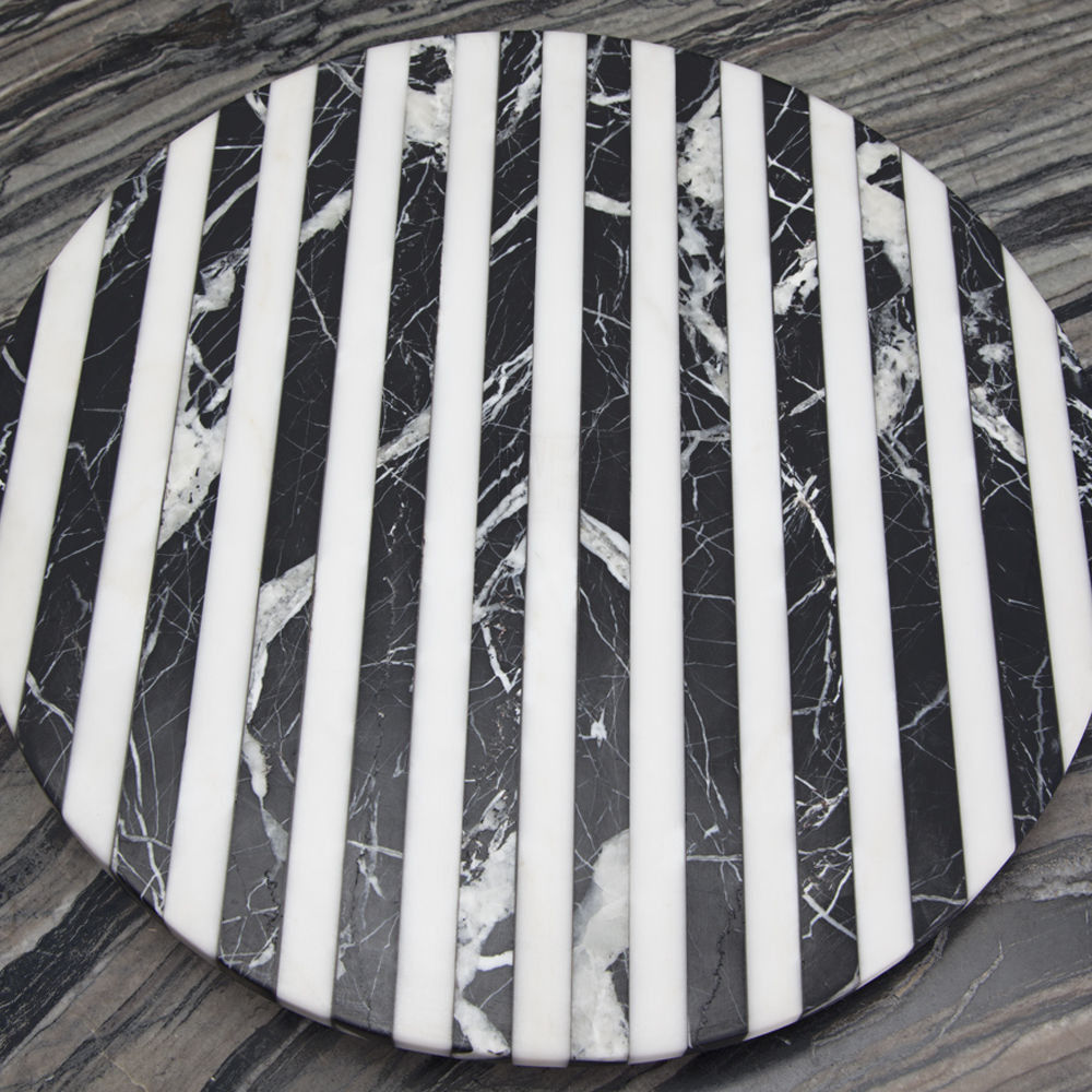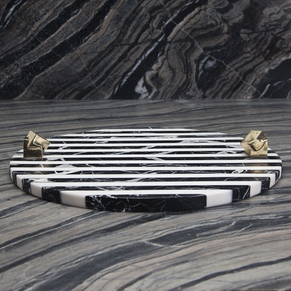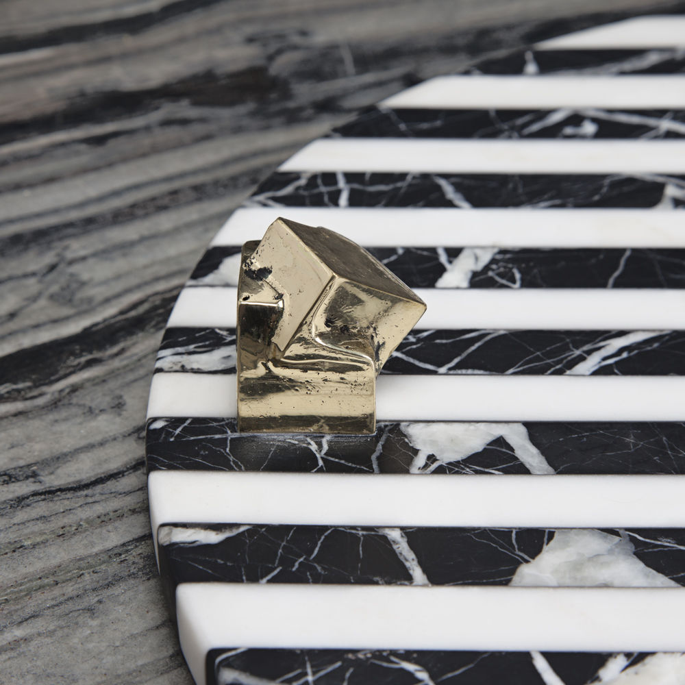 白色卡拉卡塔和黑色马奎纳大理石手工雕刻大理石拼盘的灵感来自黑白条纹图案,是一款大胆的宣言。 这款拼盘采用手工挑选的铸造青铜作为细节,非常适合豪华娱乐。