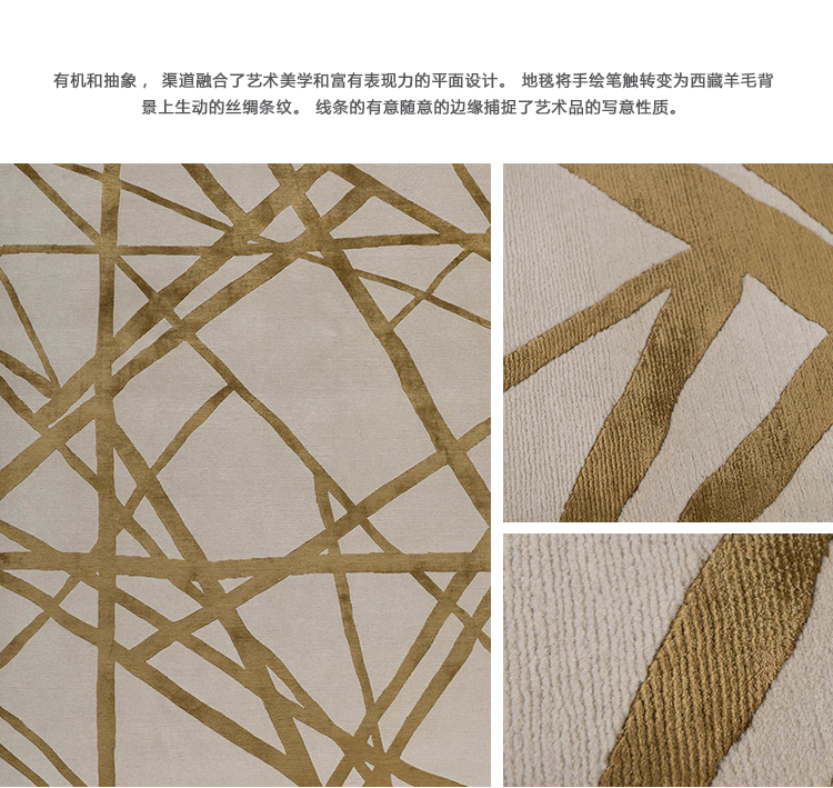 有机和抽象,渠道融合了艺术美学和富有表现力的平面设计。 地毯将手绘笔触转变为西藏羊毛背景上生动的丝绸条纹。 线条的有意随意的边缘捕捉了艺术品的写意性质。