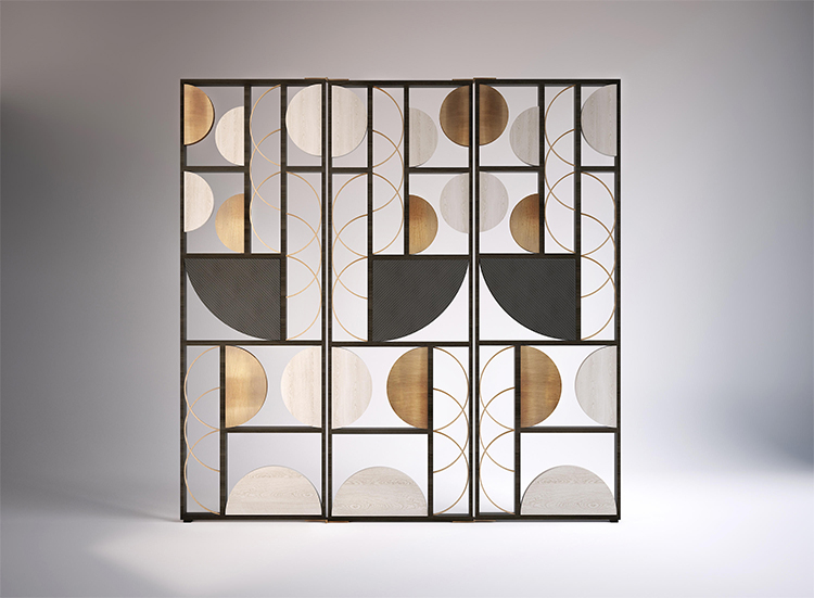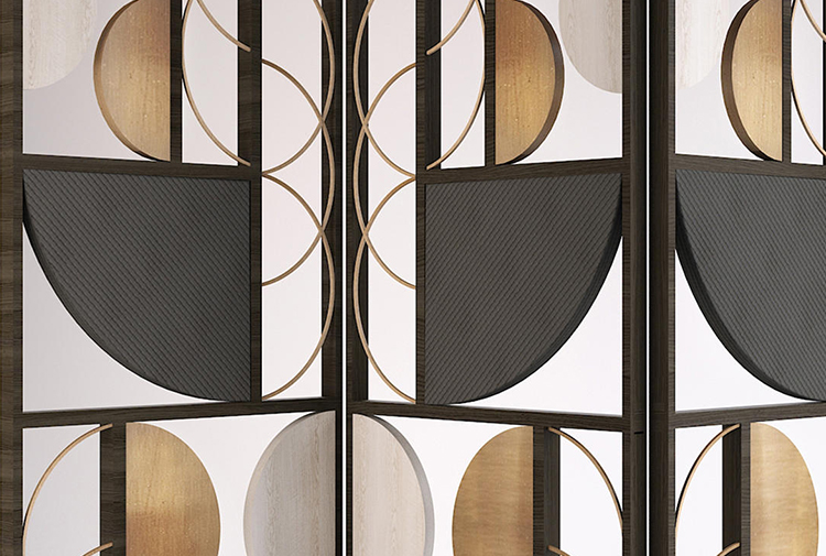 高耸的墙,同时结合和分离。 这款刺绣面料融合了复古与现代魅力,在完整与空卷之间形成鲜明对比。 材料的优雅增加了设计的强度,使其在抛光金属板中找到重心。
