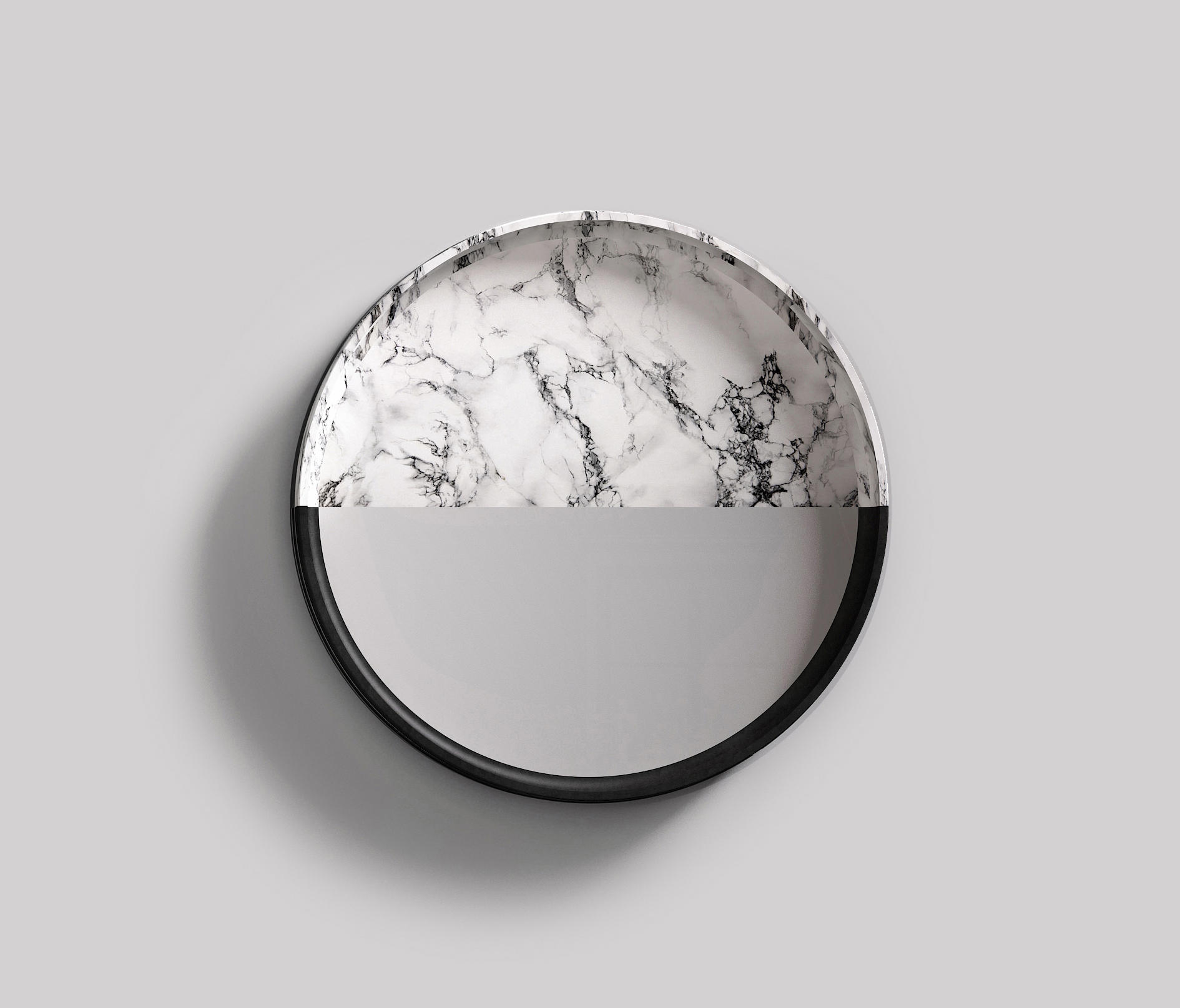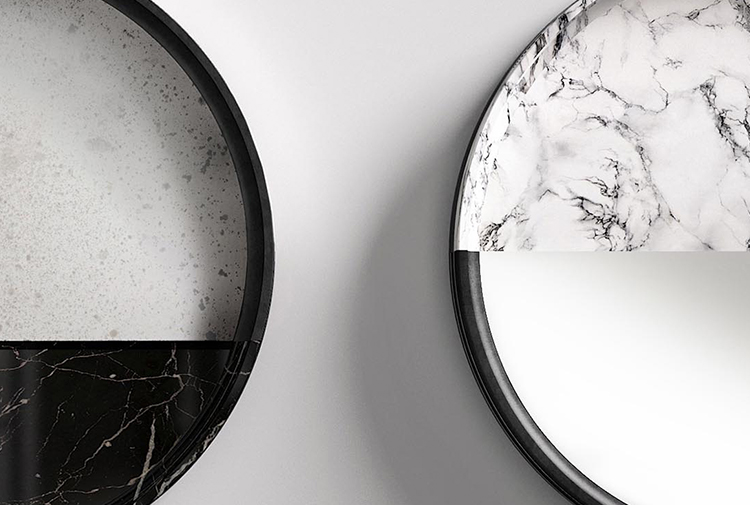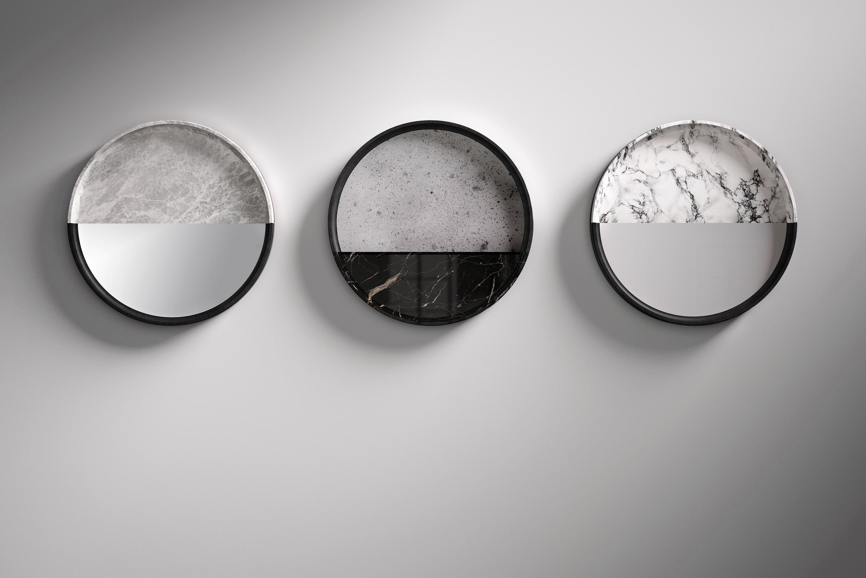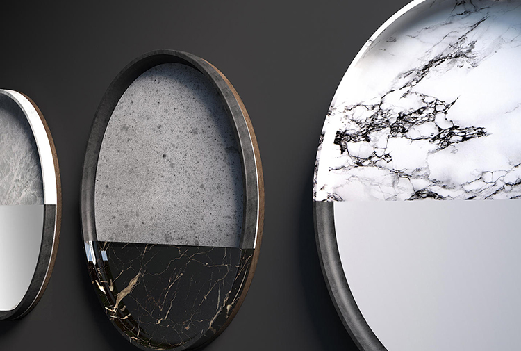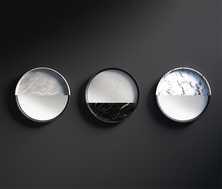 一系列镜子,玻璃增强了大理石和石头纹理。 轻盈和坚固,难以捉摸和存在,灯光和阴影:相反,吸引着基本和令人惊讶的形式。 悬挂在黑暗或明亮的墙壁上,一个接一个地,三个单元装饰明亮的房间设置。
