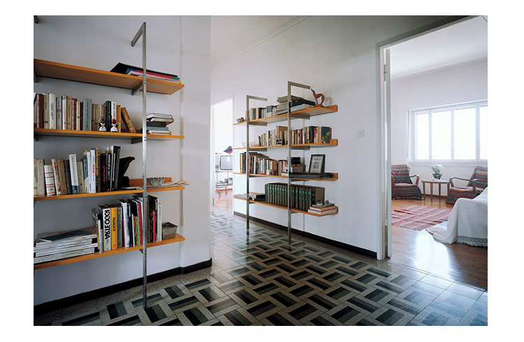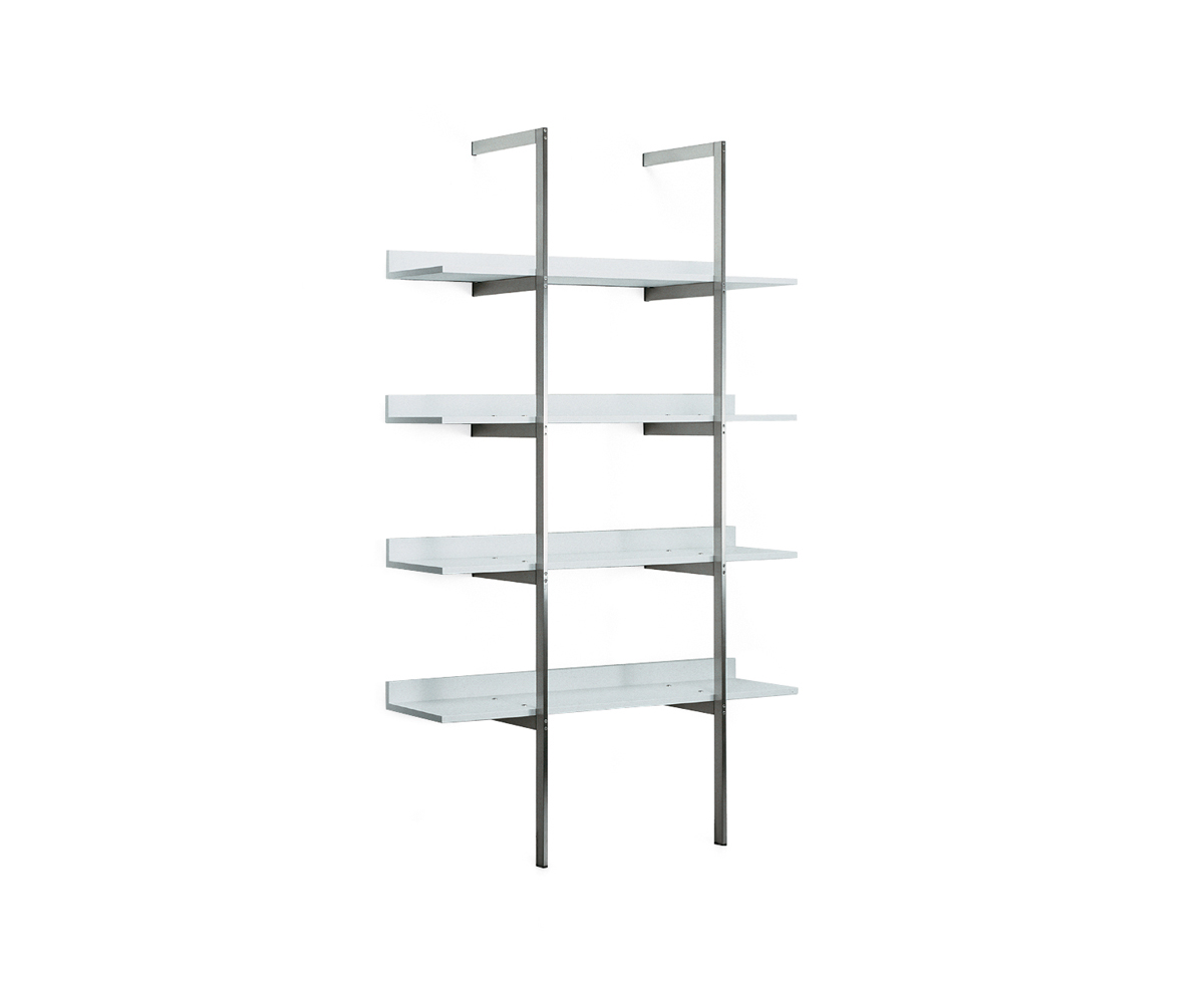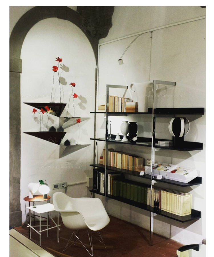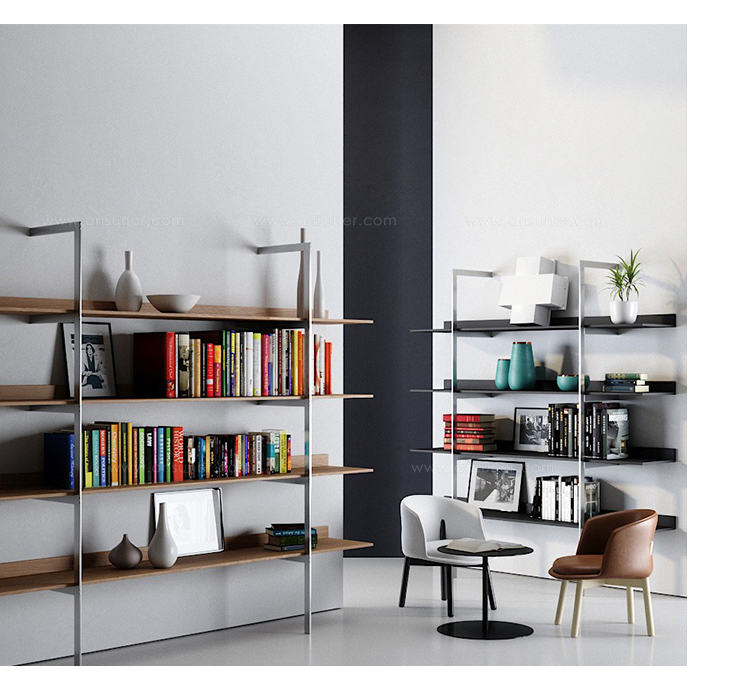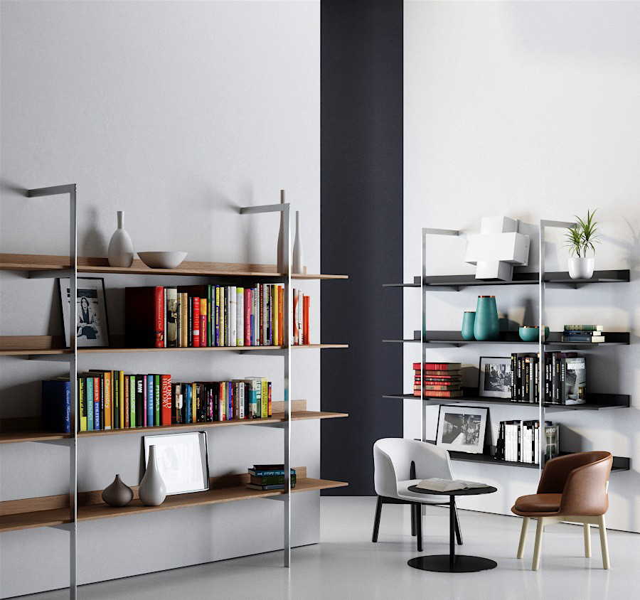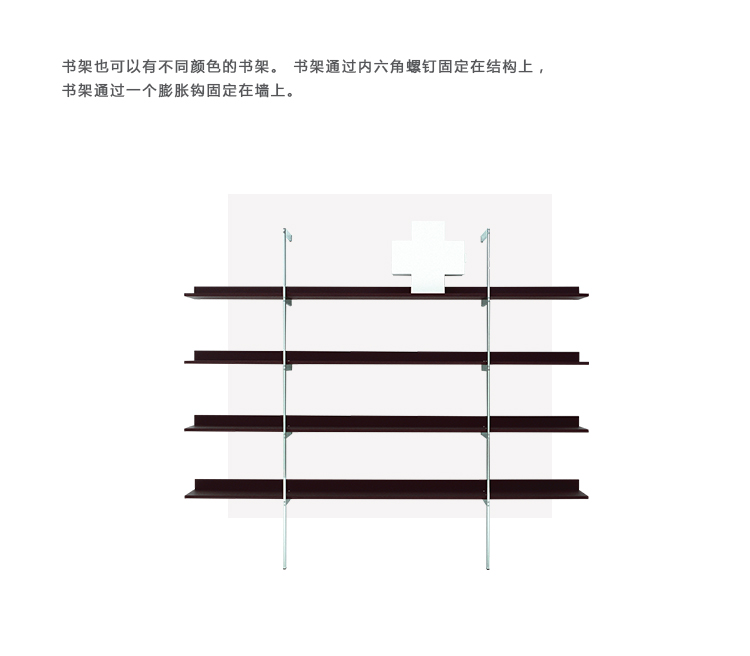 带金属框架和木制书架的系列壁式书柜。框架由抛光镀铬金属制成的两个簧片组成。架子可以是哑光或抛光漆器的所有颜色的集合:自然或温格染色橡木。书架也可以有不同颜色的书架。书架通过内六角螺钉固定在结构上,书架通过一个膨胀钩固定在墙上。