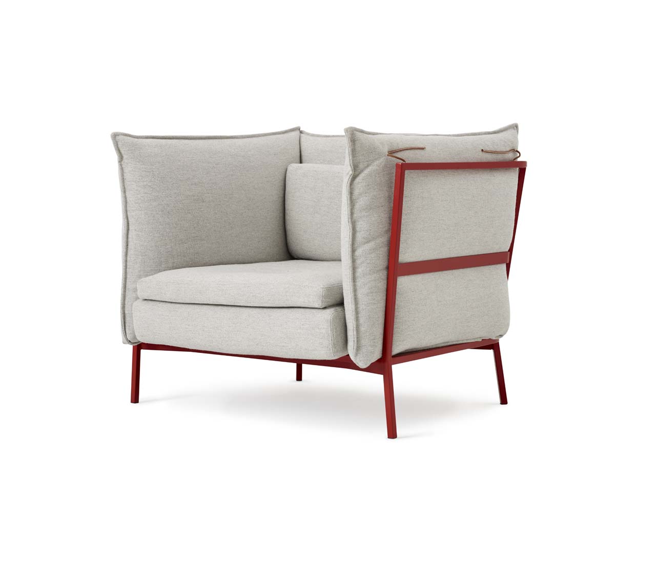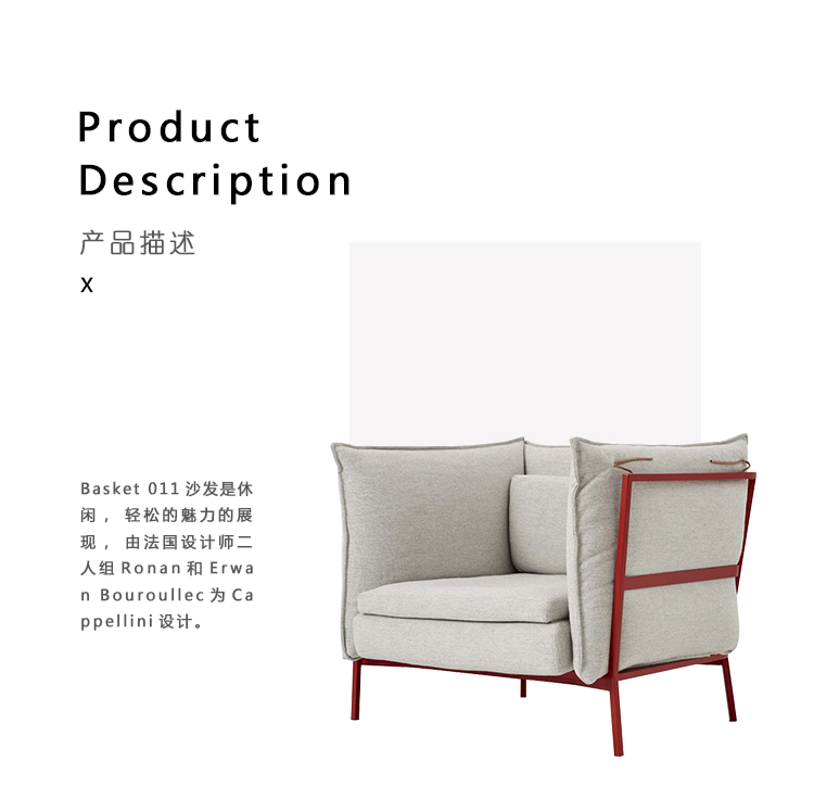 Basket 011沙发由哑光涂漆金属结构支撑,白色,红色,灰色或黑色。 可拆卸的覆盖物可从该系列的面料和皮革中获得; 垫套也可以结合不同的面料和皮革制成。