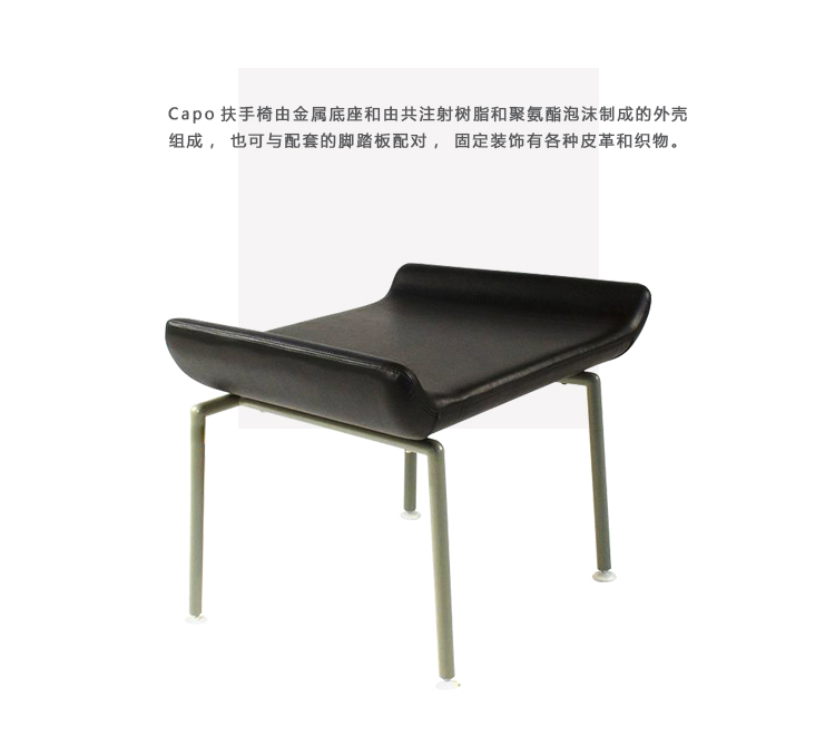 Capo扶手椅由金属底座和由共注射树脂和聚氨酯泡沫制成的外壳组成,也可与配套的脚踏板配对,固定装饰有各种皮革和织物:材料可用于均匀覆盖椅子,或在正面和背面之间形成对比。