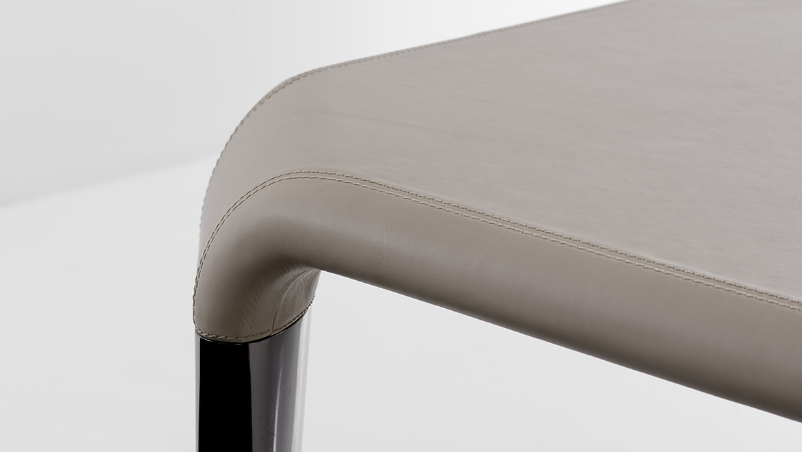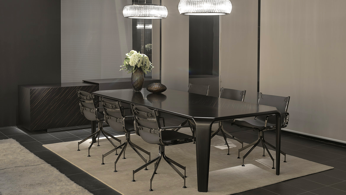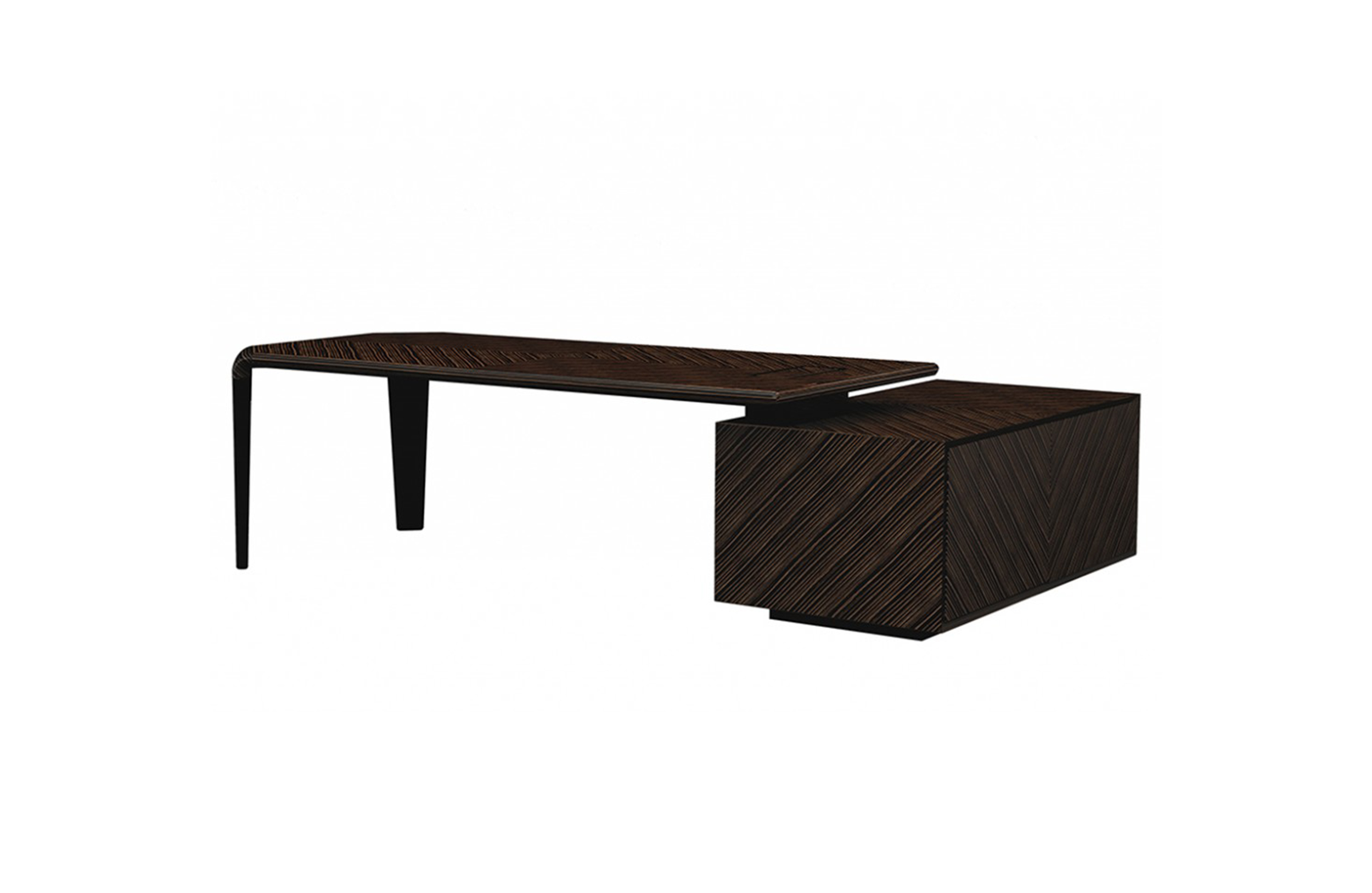 Ebony Macassar with diamond drawing matt finishing. Spacer-joint undertop in glossy brushed wood coordinated with the leather top, matt or polished