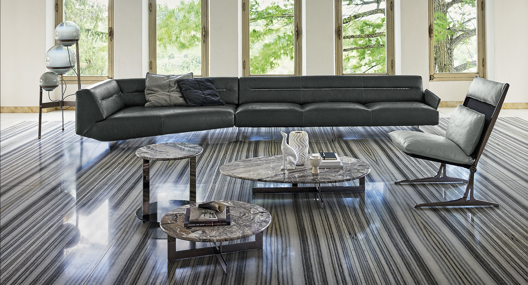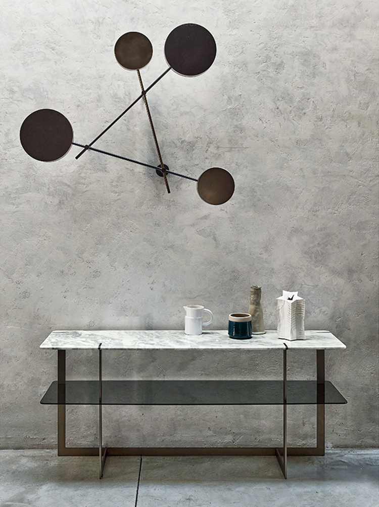 道格拉斯是一个由金属、大理石和玻璃组成的茶几系列。这些桌子可以围绕在沙发周围,因为它们可以放在前面、后面或侧面,可以用作茶几或边几。