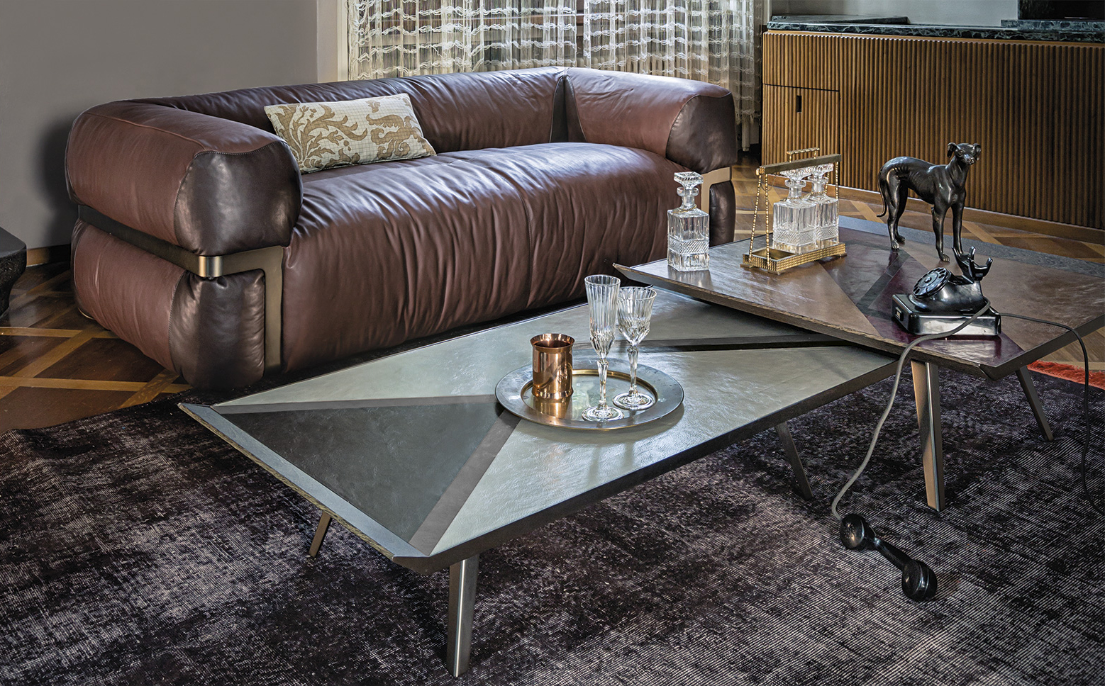 由Gino Carollo设计的的太空入侵者是矩形的系列矮桌子。它们的独特之处在于上面部分覆盖了植物鞣制的皮革,这让人想起了非洲的几何图案,混合了自然和强烈的色彩。