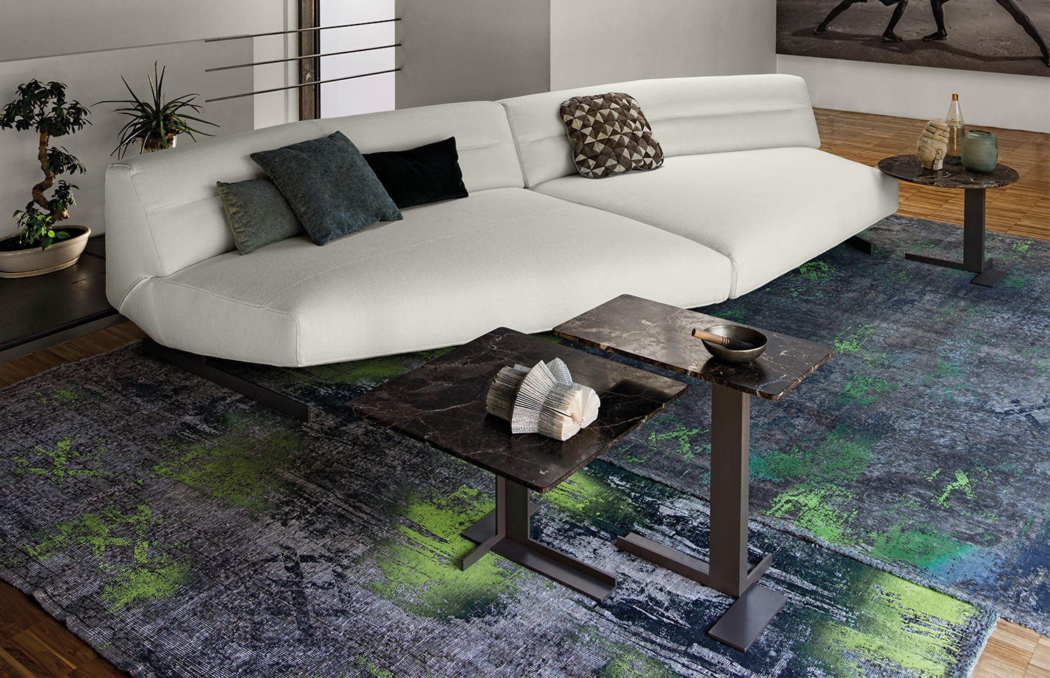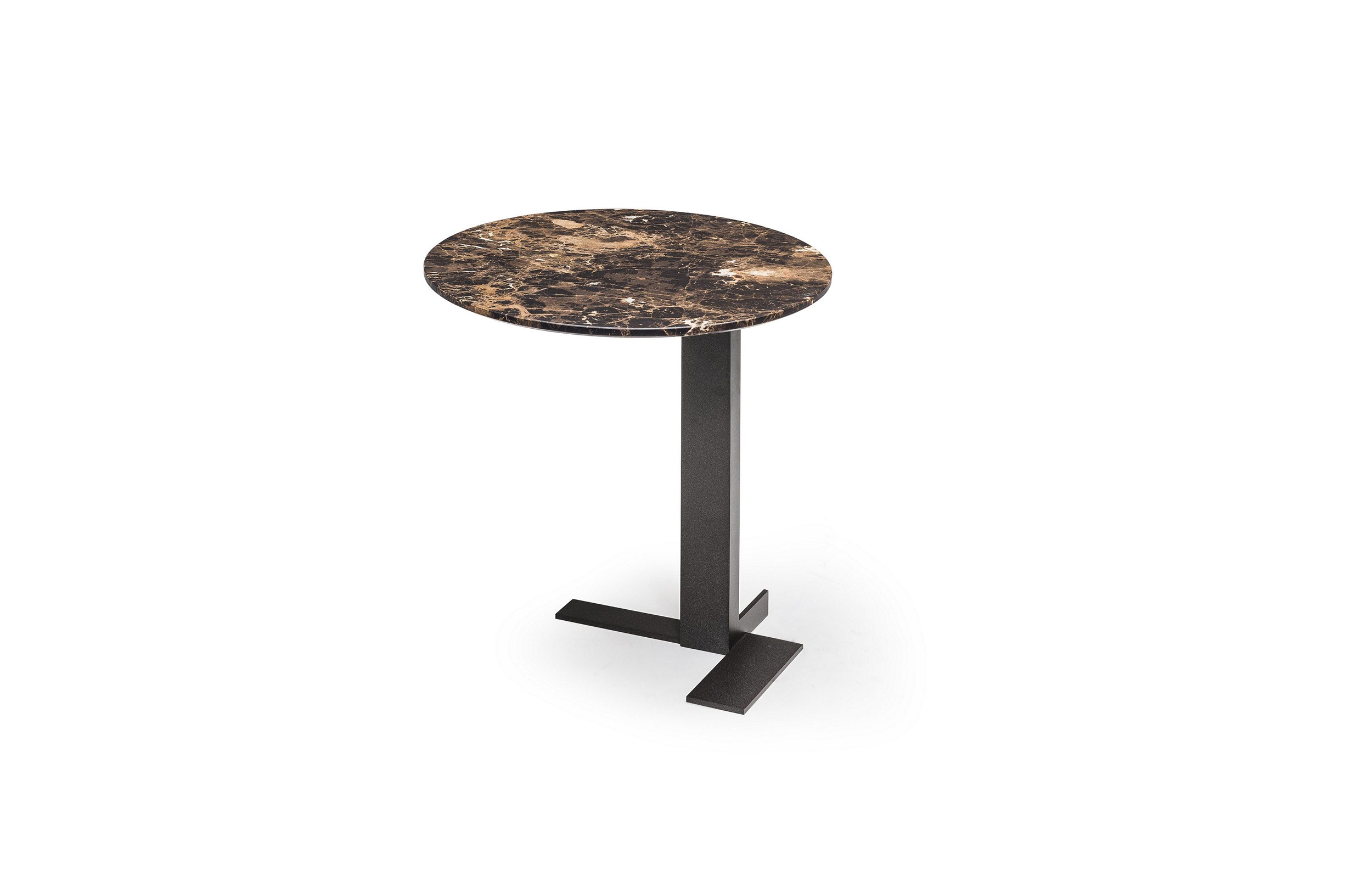 这些小桌子的外形很有吸引力:不同寻常的对比,柔软的和刚硬的组成部分共存,传达出和谐的、国际化的风格。它们可以像小行星一样被放置在房间里。有三种桌面可供选择:圆形、方形和长方形,桌面材质为大理石或砂岩,也有钝边的熏玻璃桌面。金属基材有云母棕,氧化灰或黑镍。