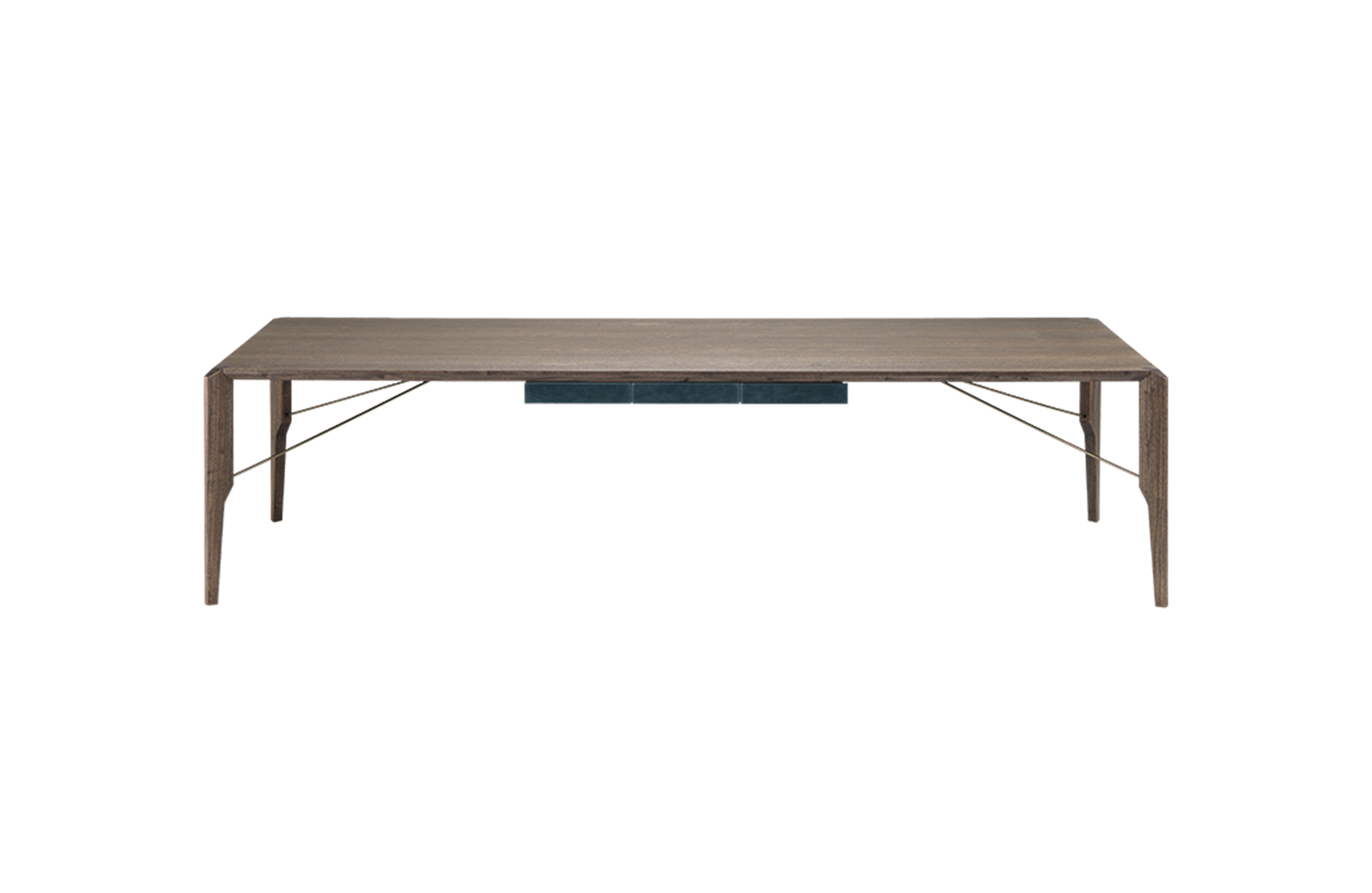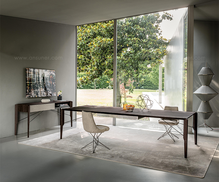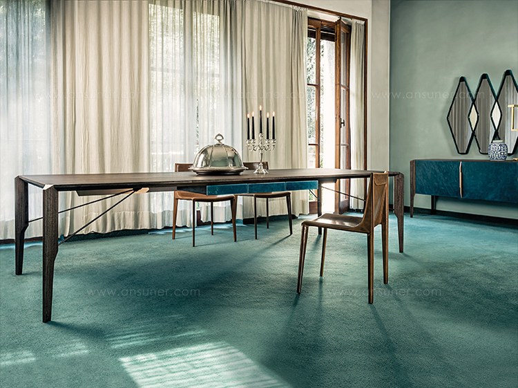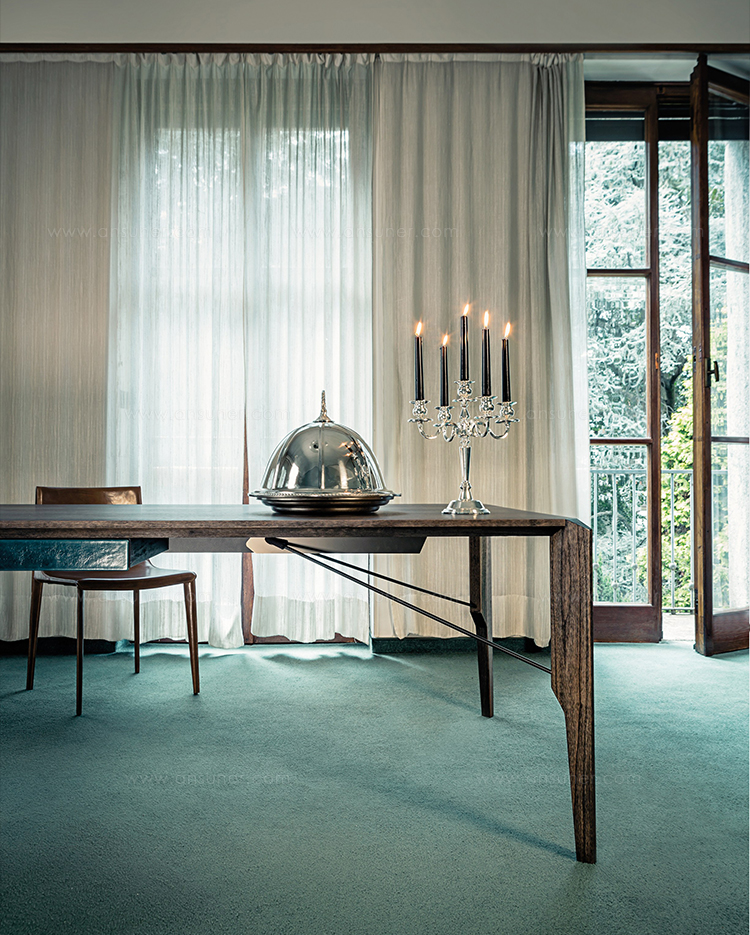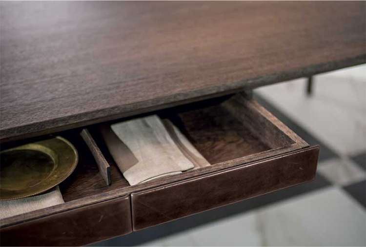 Manzoni&Tapinassi设计的Glorious餐桌运用了最基本的线条设计,以获得极度轻盈的效果。桌面可在摩卡橡木、卡纳莱托胡桃木或苏木皮拉木材中进行选择,桌面下方的抽屉上覆盖有植物鞣制的不同颜色的皮革,可以从强烈的茄皮紫和天然的灰色等各种颜色间进行选择。其独特的特点是每条桌脚上都连接着金属支柱,使其变得薄而又轻盈。