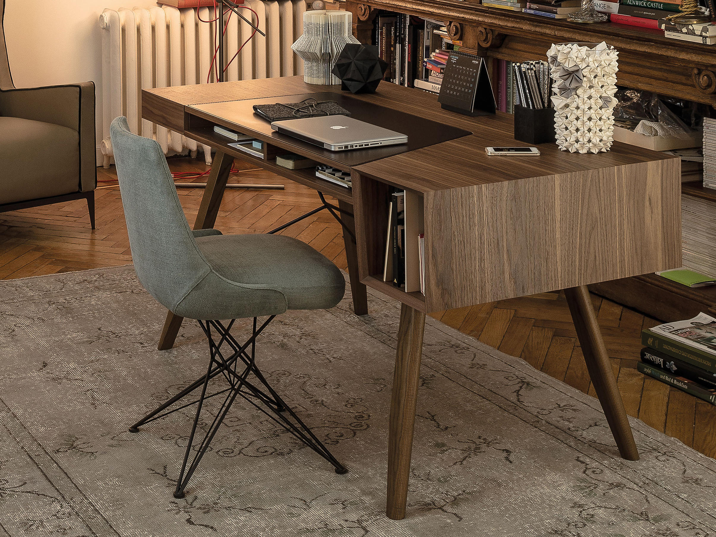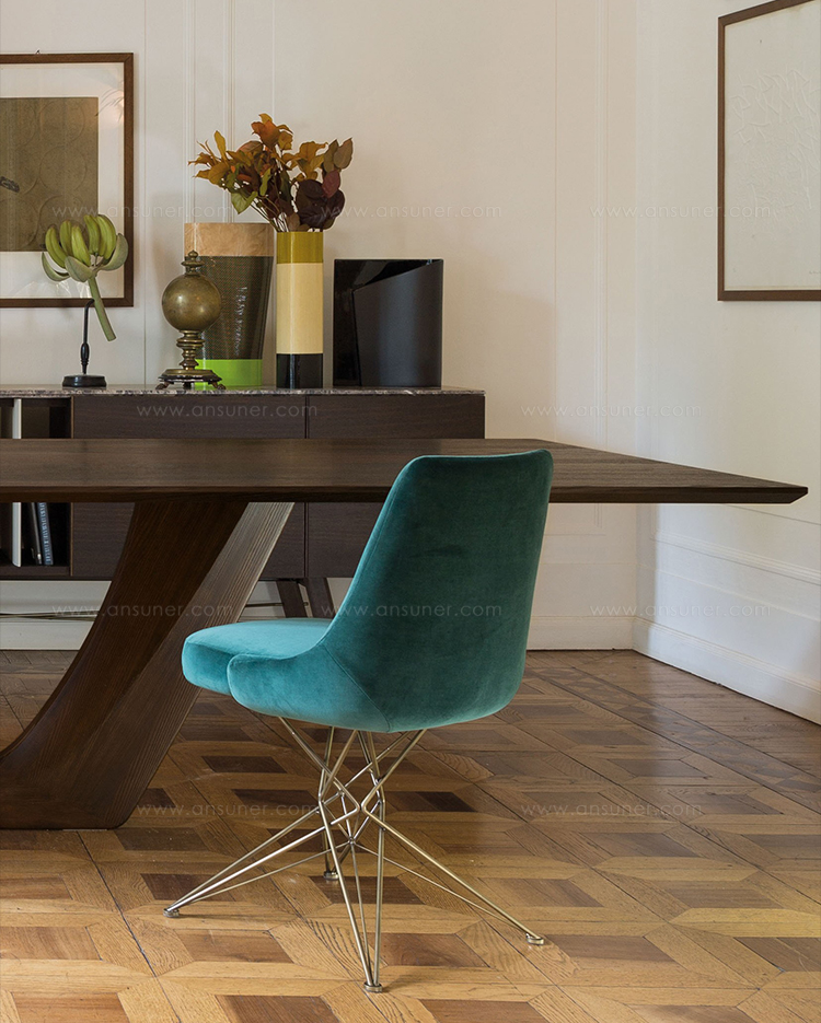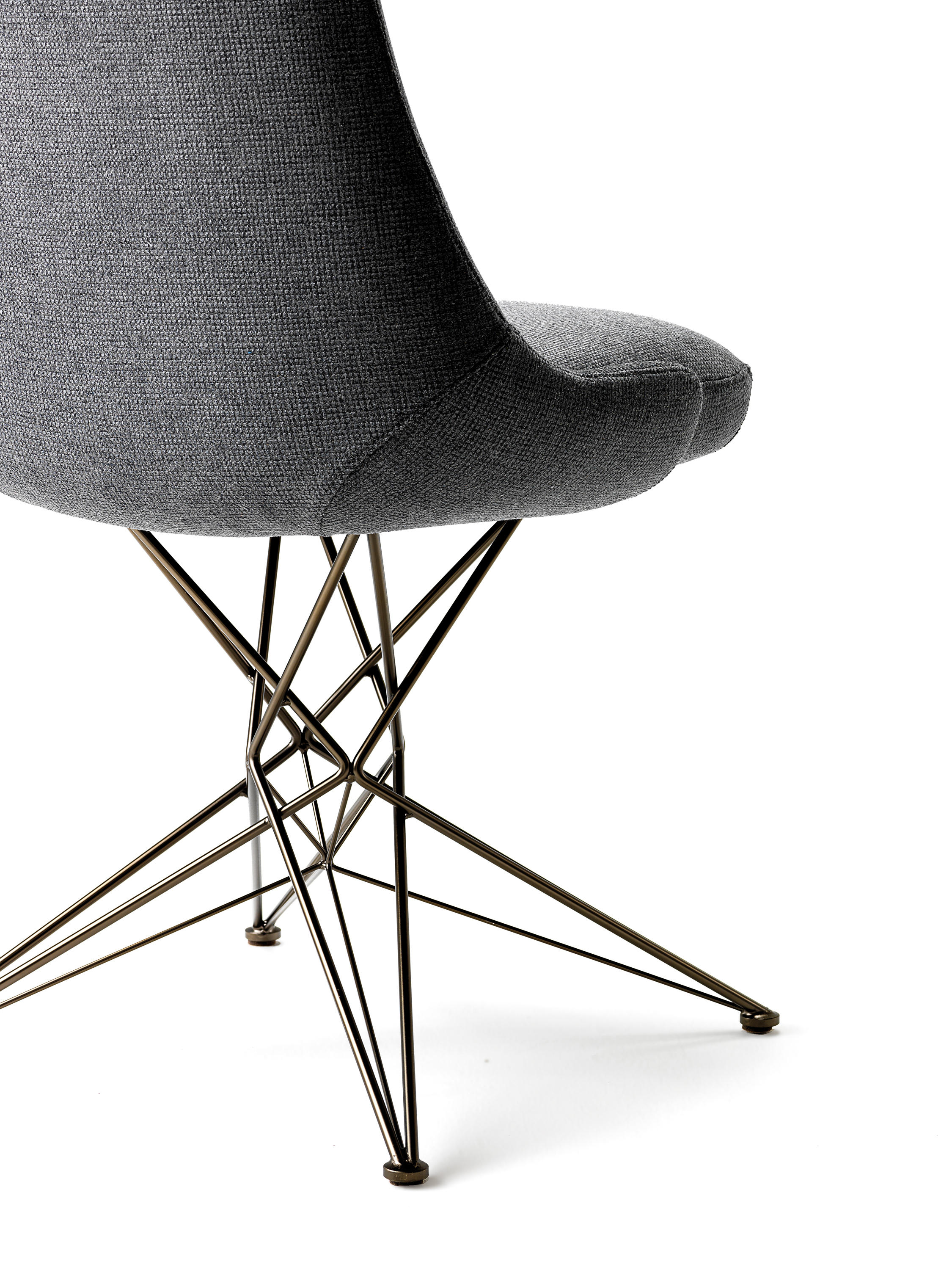 由金属丝制成的轻盈而立体腿部与座椅靠背的结构形成对比,从而在形状和体积之间营造出一种和谐的平衡效果。座椅靠背略微弯曲,将座椅的衬垫包裹起来,以符合人体工程学和动态舒适性。