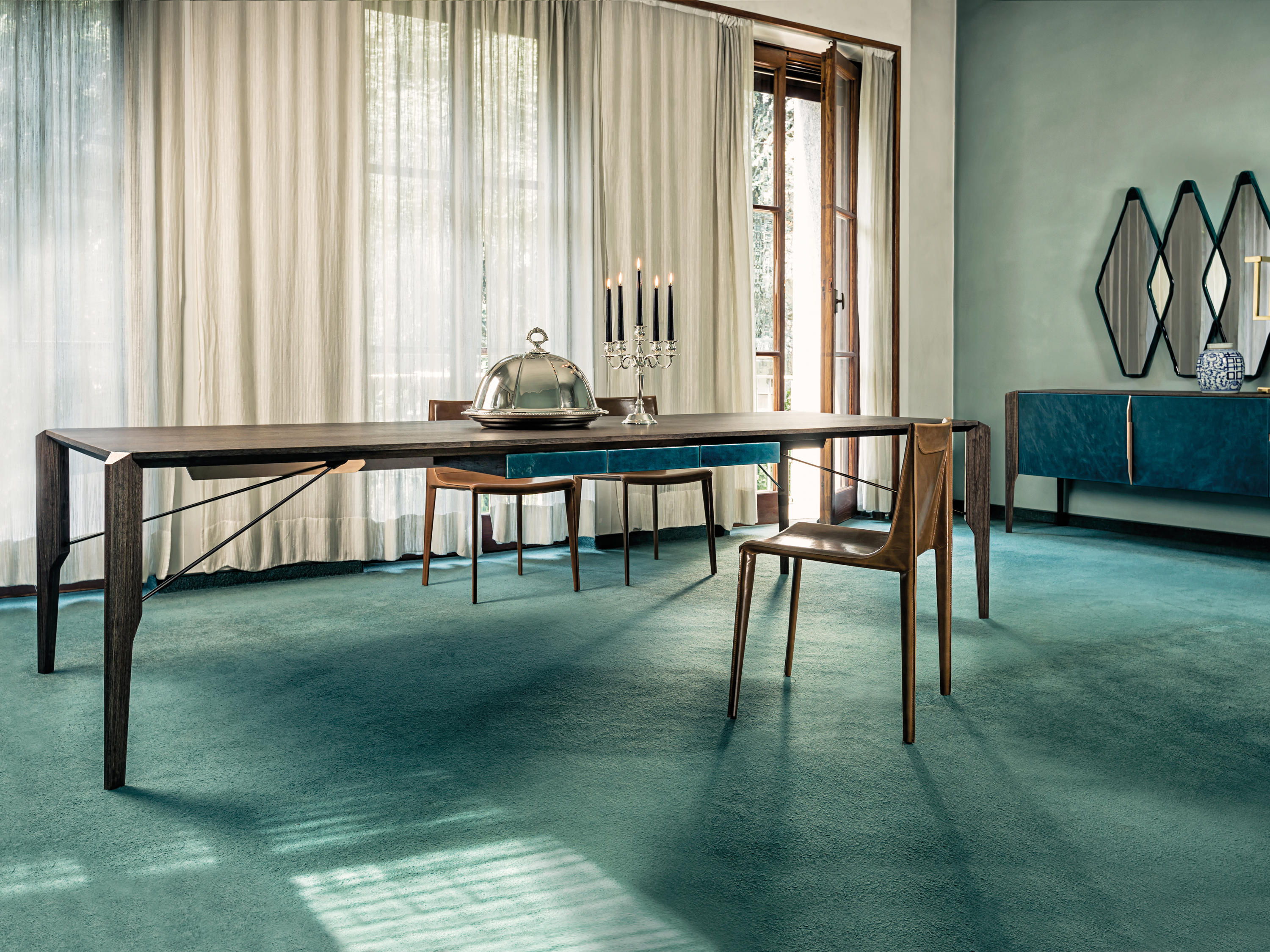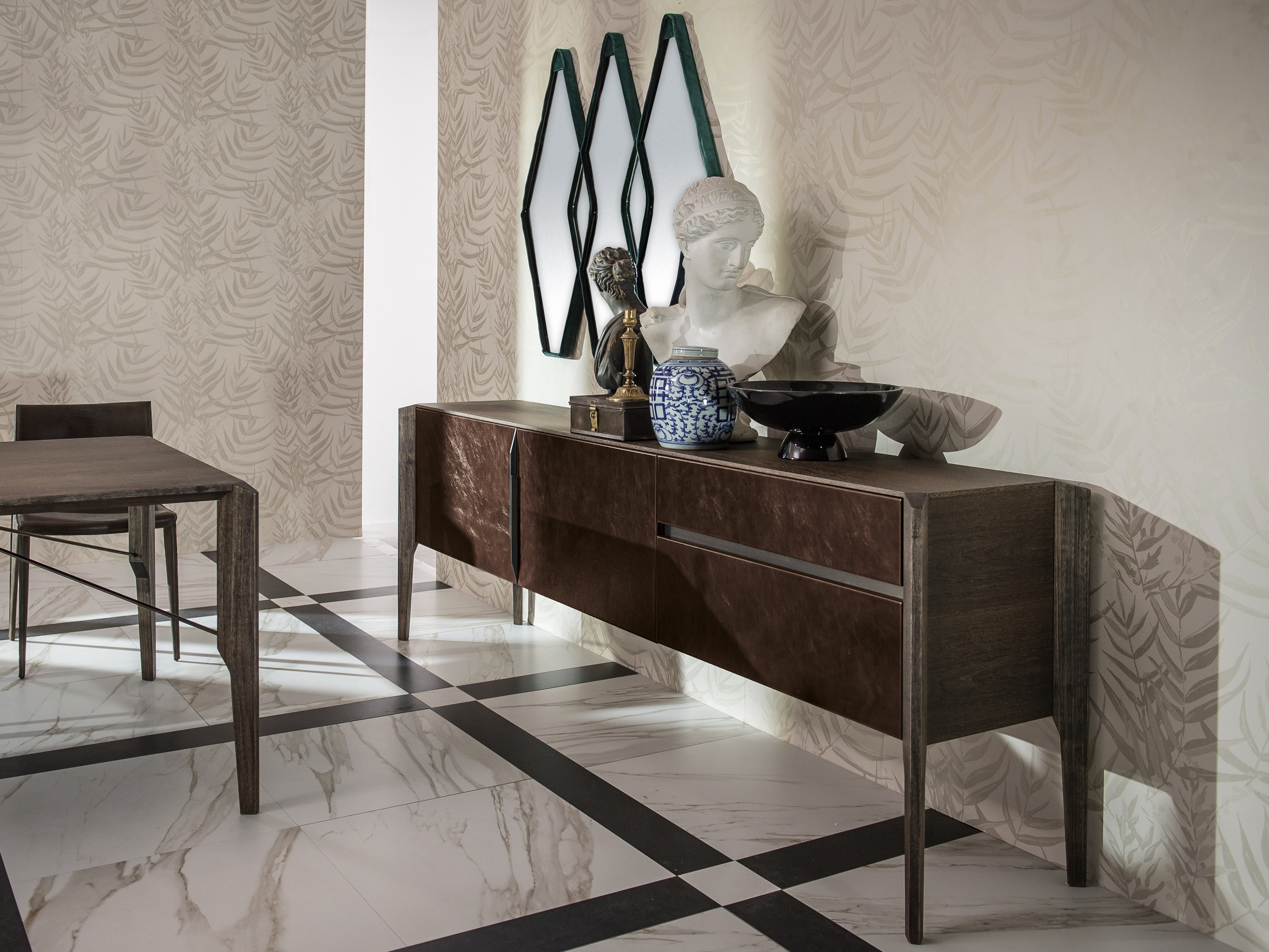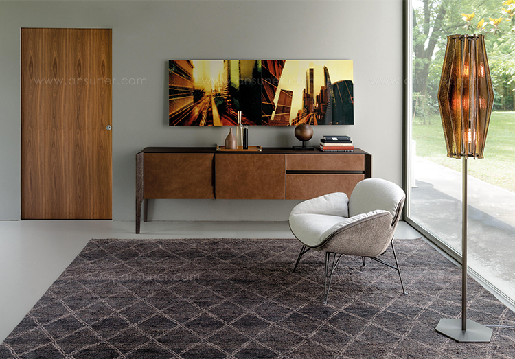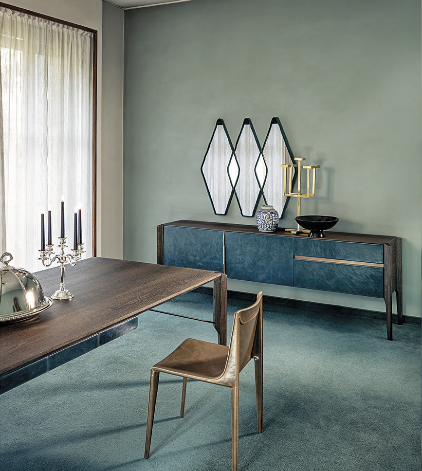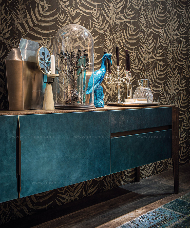 完成最低生活的家具, 但也为一个更经典的住宿, 是由 Manzoni 和 Tapinassi 的荣耀餐具柜, 在莫卡, 卡纳莱托核桃或 Sucupira, 用金属零件涂在云母颜色或镀锌钛, 与印记很纯洁门和抽屉可以用植物皮革覆盖。