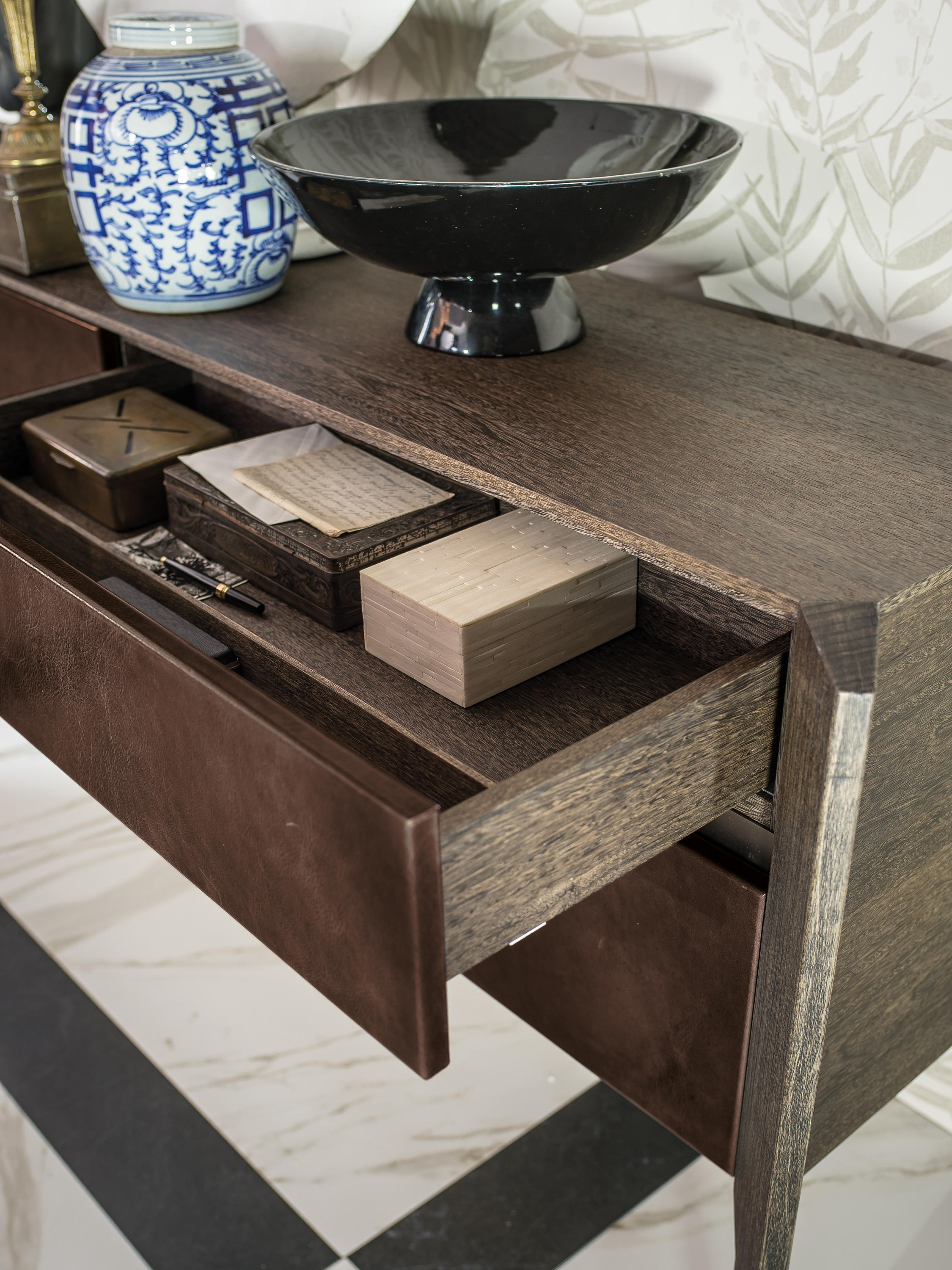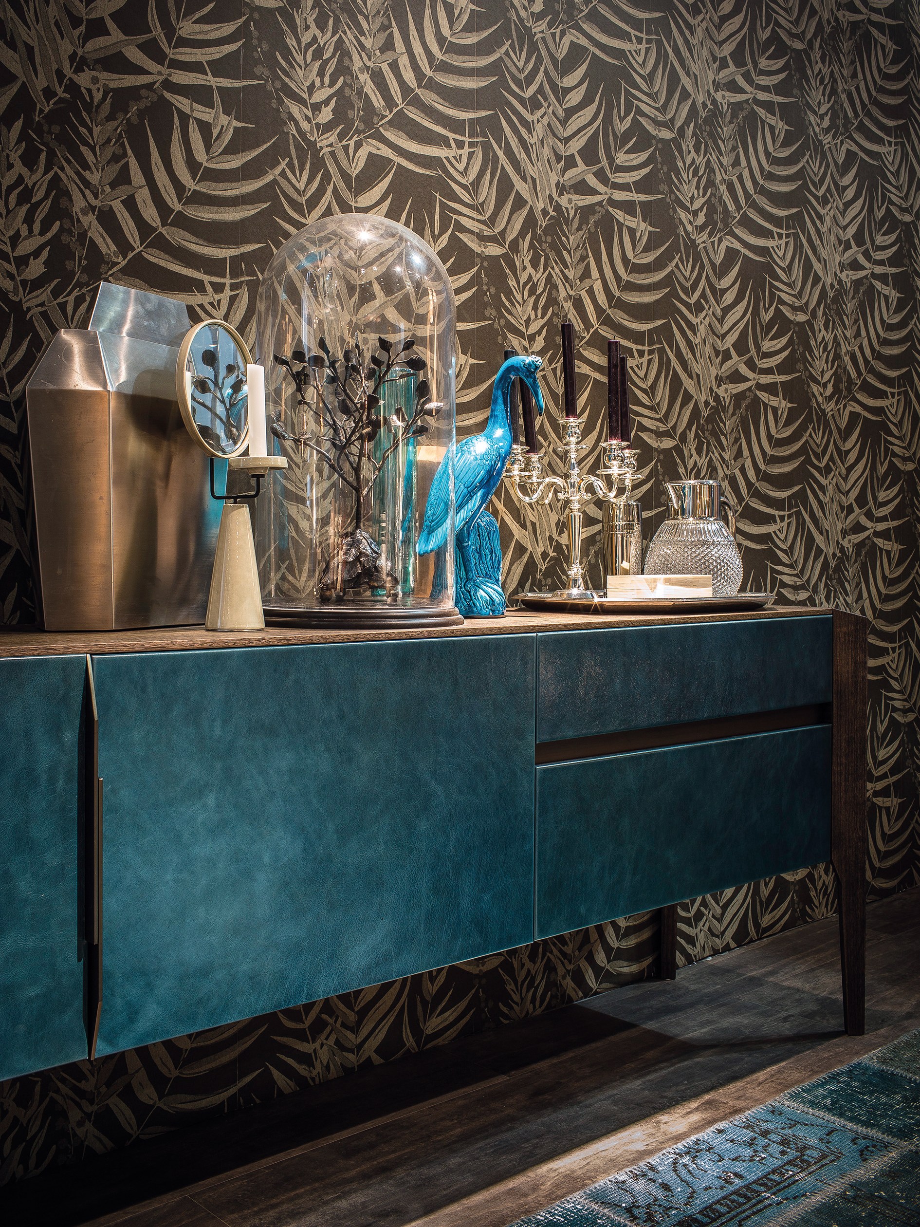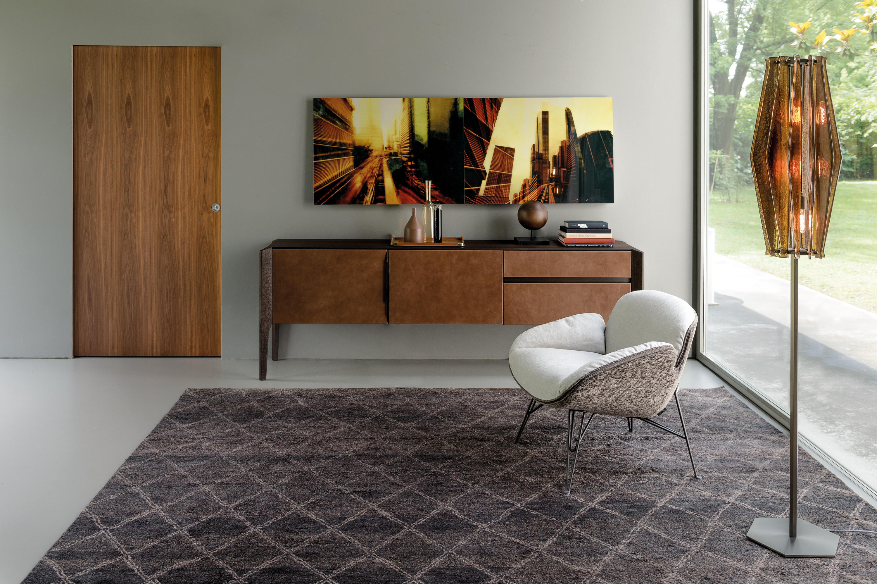 完成最低生活的家具, 但也为一个更经典的住宿, 是由 Manzoni 和 Tapinassi 的荣耀餐具柜, 在莫卡, 卡纳莱托核桃或 Sucupira, 用金属零件涂在云母颜色或镀锌钛, 与印记很纯洁门和抽屉可以用植物皮革覆盖。