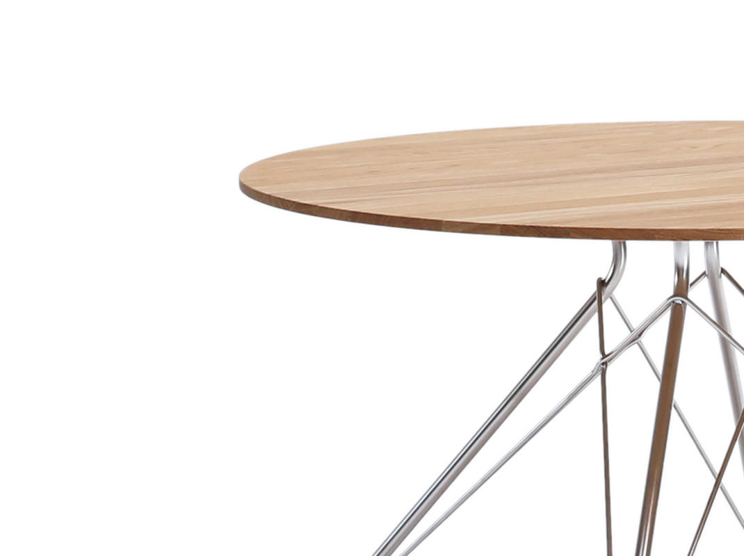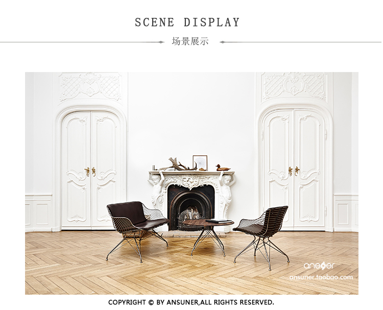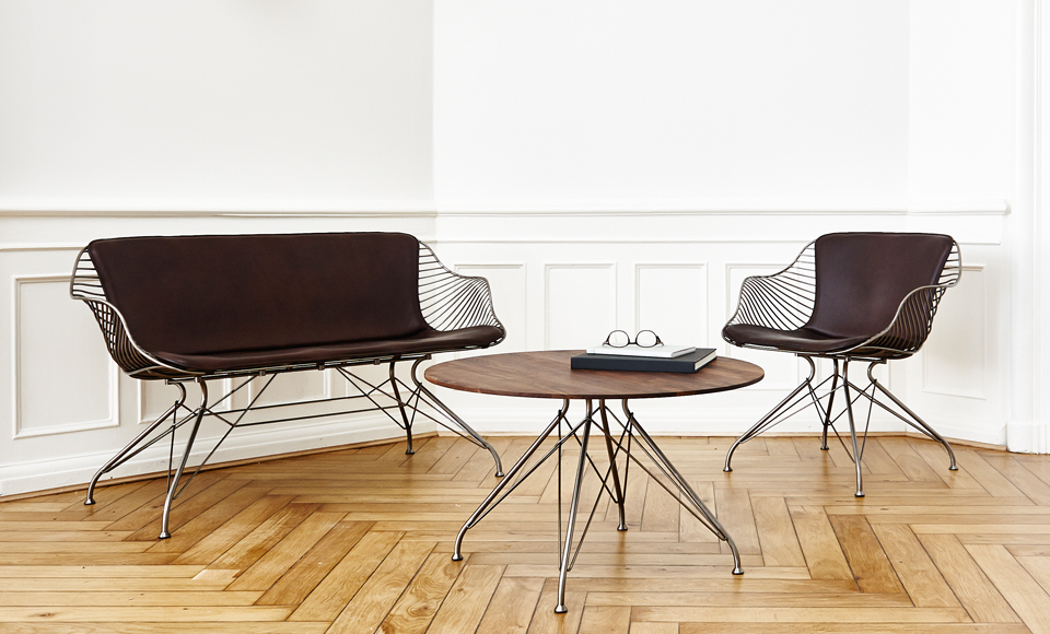 金属丝茶几由Jasper Overgaard和Christian Dyrman设计。2014年设计的金属丝躺椅是一种更低、更宽、更平放的版本,与铁丝餐椅相比。