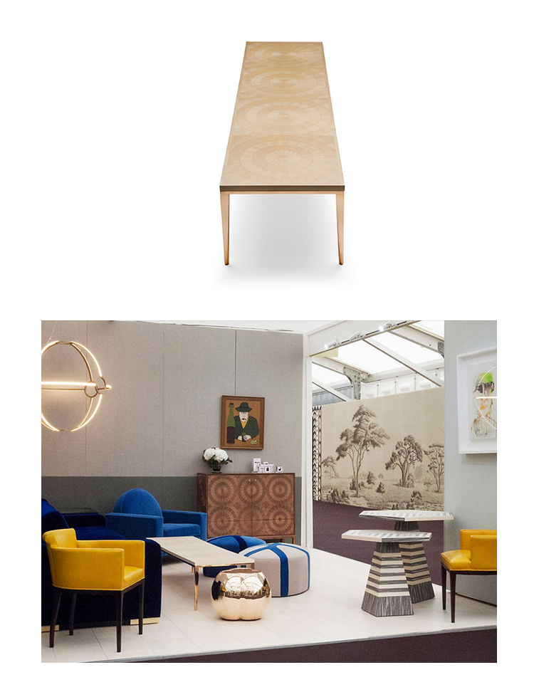手工铺设的径向同心圆形对比色调和美国梧桐切割在坚实的抛光青铜腿上,这款特别版的Catalyst咖啡桌远远望去,而坐在附近则是错综复杂的美丽。