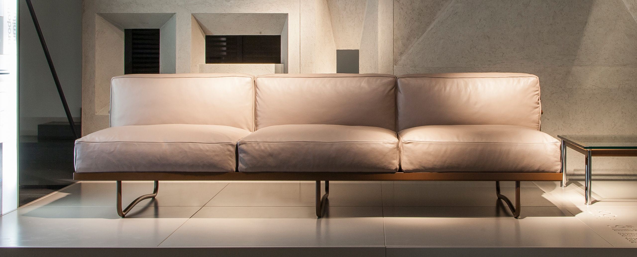 靠垫与后框架通过铰链连接,可放低,从而增加沙发座宽度,变成一张单人床。皮革或布艺面料的软包,可通过拉链全部拆下替换。原版是安置在巴黎Nungesser-et-Coli大街24号的原Le Corbusier和他妻子的公寓。