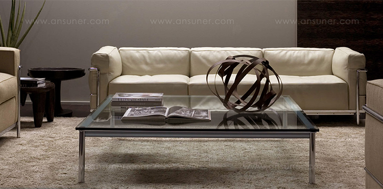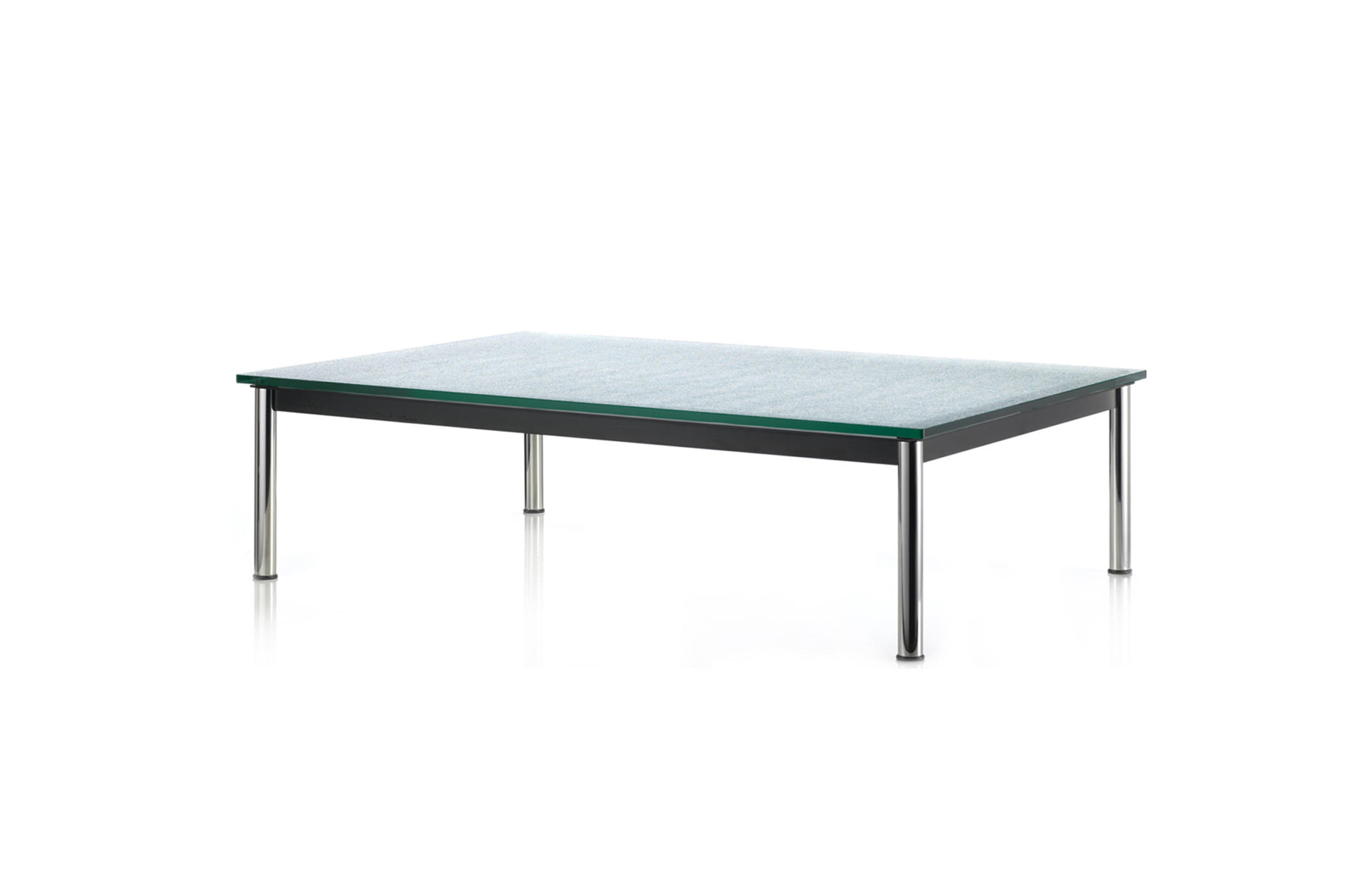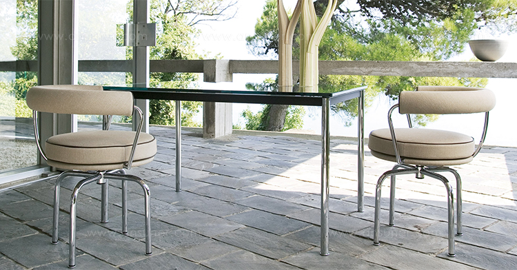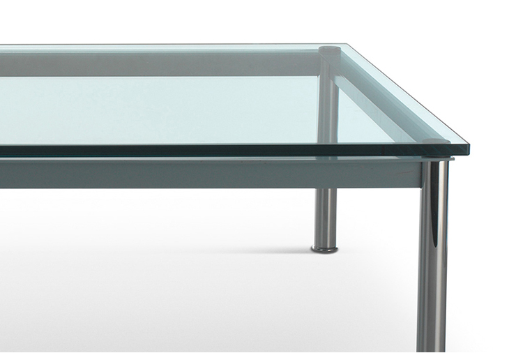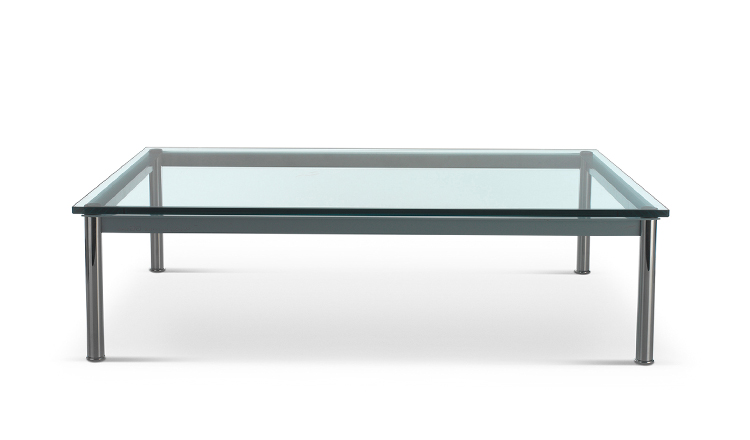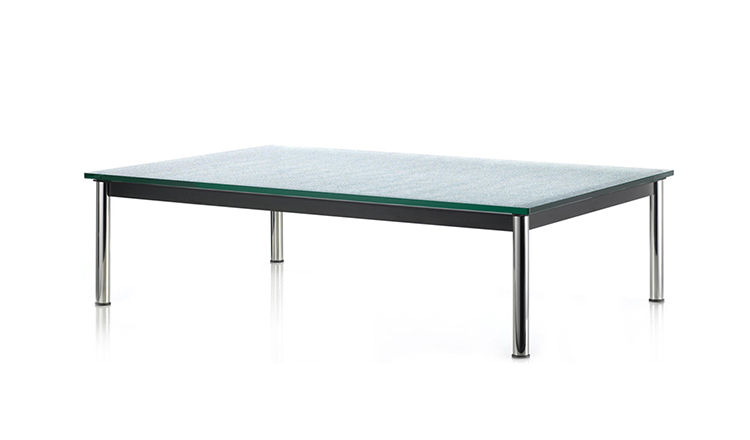 1984年改版的Charlotte Perriand LC10桌子。CR3三价镀铬钢结构涂哑光漆,有多种色彩选择:灰、淡蓝、绿、棕,泥土和象牙或黑色。玻璃台面有透明和纹理两种,15mm厚。也有户外版本。长宽高120x80x70cm, 看起来像是1929年巴黎秋季沙龙中参展的桌子,“居室的装置”的一部分。这款桌子最大地简化了框架,镀铬管状桌腿和喷漆的边饰都很极简,金属处理的表现力实现了桌子的完美效果。