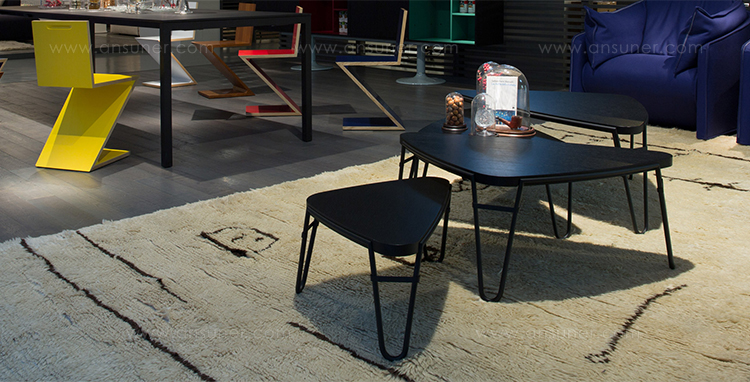 采用哑光黑色的珍贵木材或黑色实木橡木或美国黑胡桃木制造的矮桌。桌面厚度和凹面刻画了正式用语中的模型特征,并创造了令人讶异的轻盈感。该款矮桌是于1969年为日本驻巴黎大使馆设计的,这款咖啡桌是技术和中继合成的胜利。