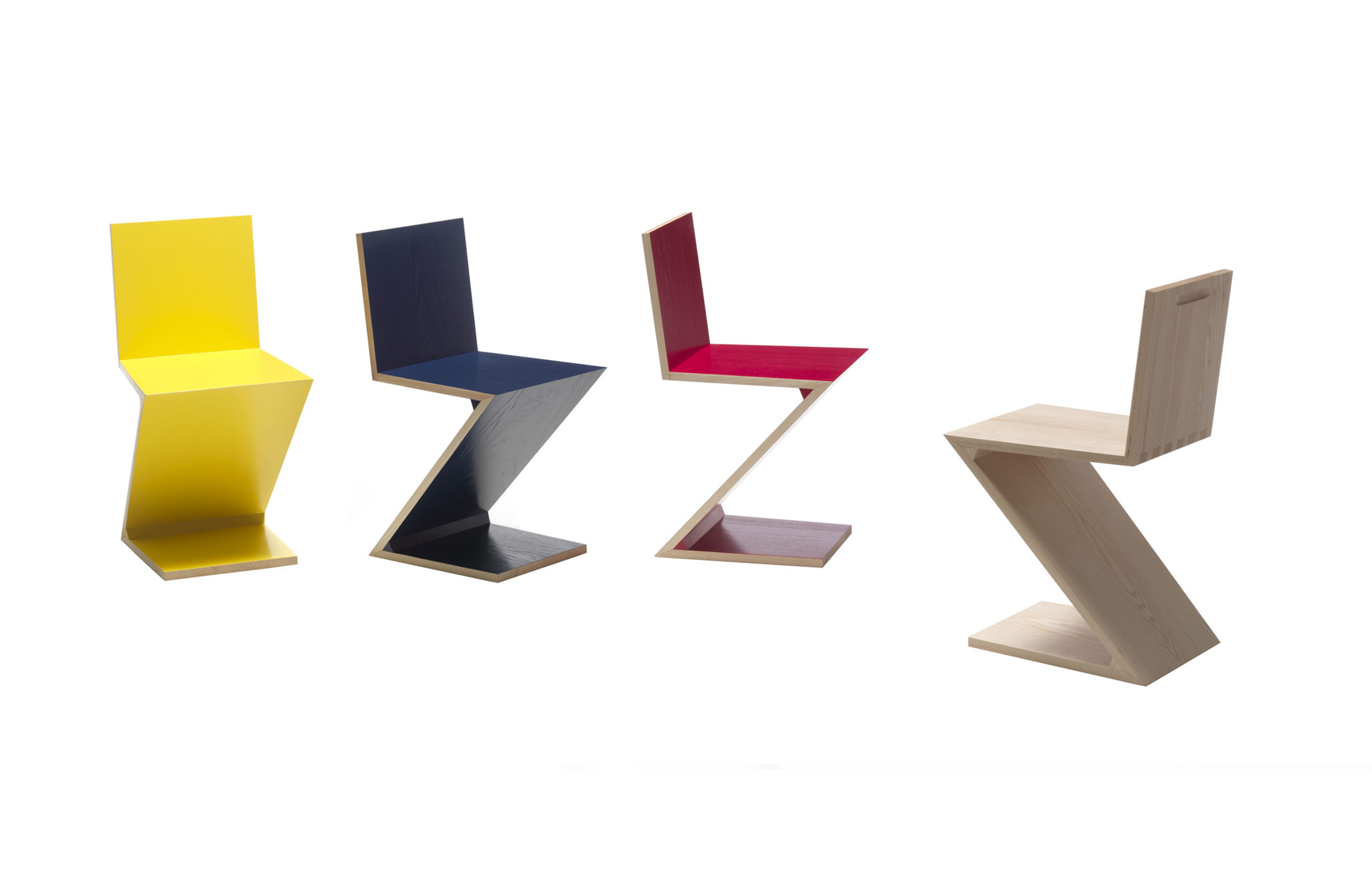 该款椅子采用天然樱桃木、天然白蜡木、或蓝色、红色、黄色、白色或黑色饰面的白蜡木制造,配有天然白蜡木边缘。靠背+座面+椅腿+椅脚。Rietveld 首次在利用新形状的场景中引入新类型椅子,归功于对角线的使用。锯齿状椅子拥有四个从顶部到底部依次优雅地弯曲的板,初看起来可能是不稳定的,但实际上非常四平八稳。