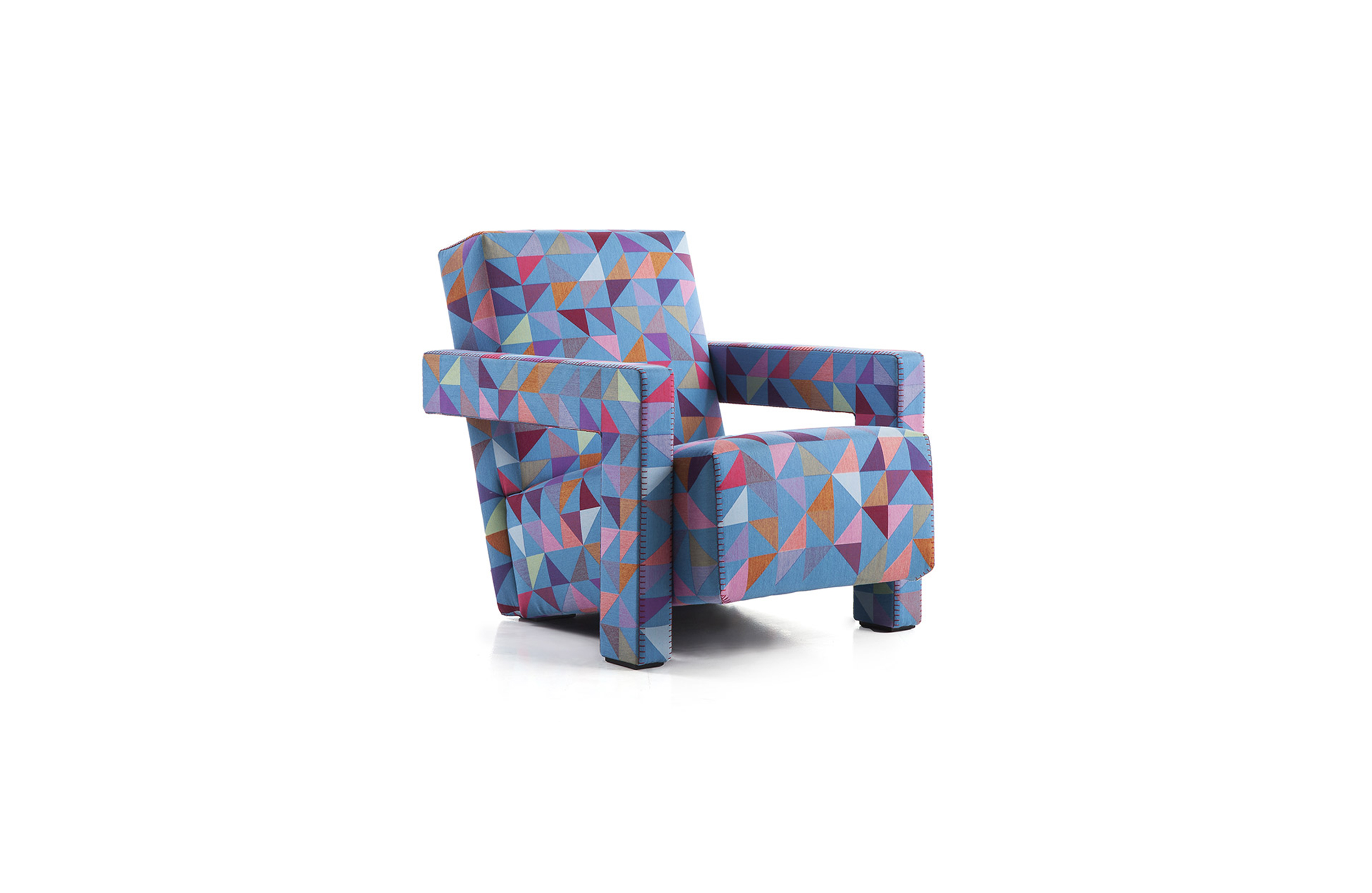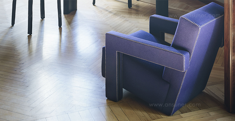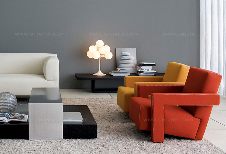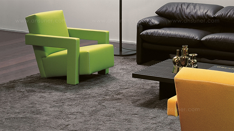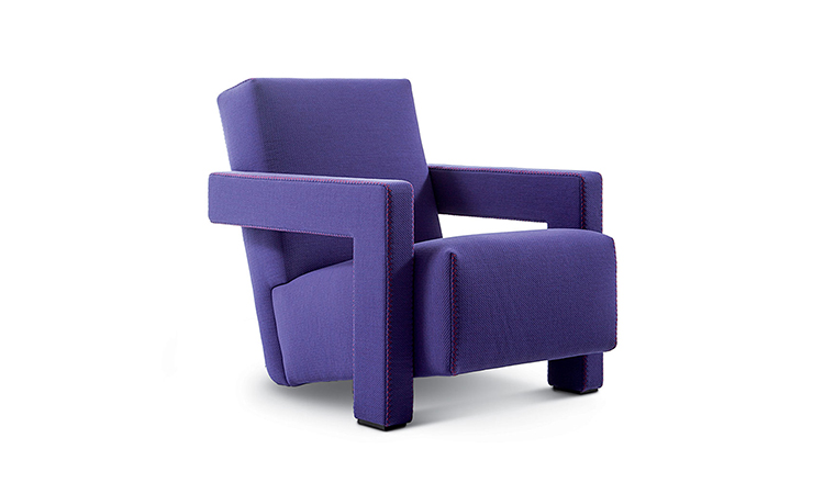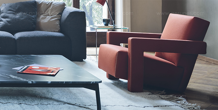 Rietveld是一位荷兰建筑师,他有强烈的实验倾向,他和蒙德里安是1917年新塑料德斯提尔运动的创始人之一,于1935年设计了Utrecht模型。这个模型是为阿姆斯特丹的Metz&co百货公司创建的,因此为大众市场设计,并代表Rietveld决定采用更“市场导向”的方式来舒适和放松。以五种不同颜色的两种可见的拼接(鞍针或齐格扎格)为例,强调了元素的分解。